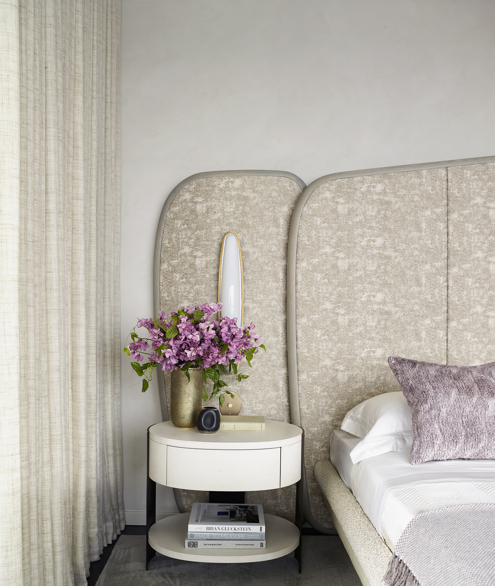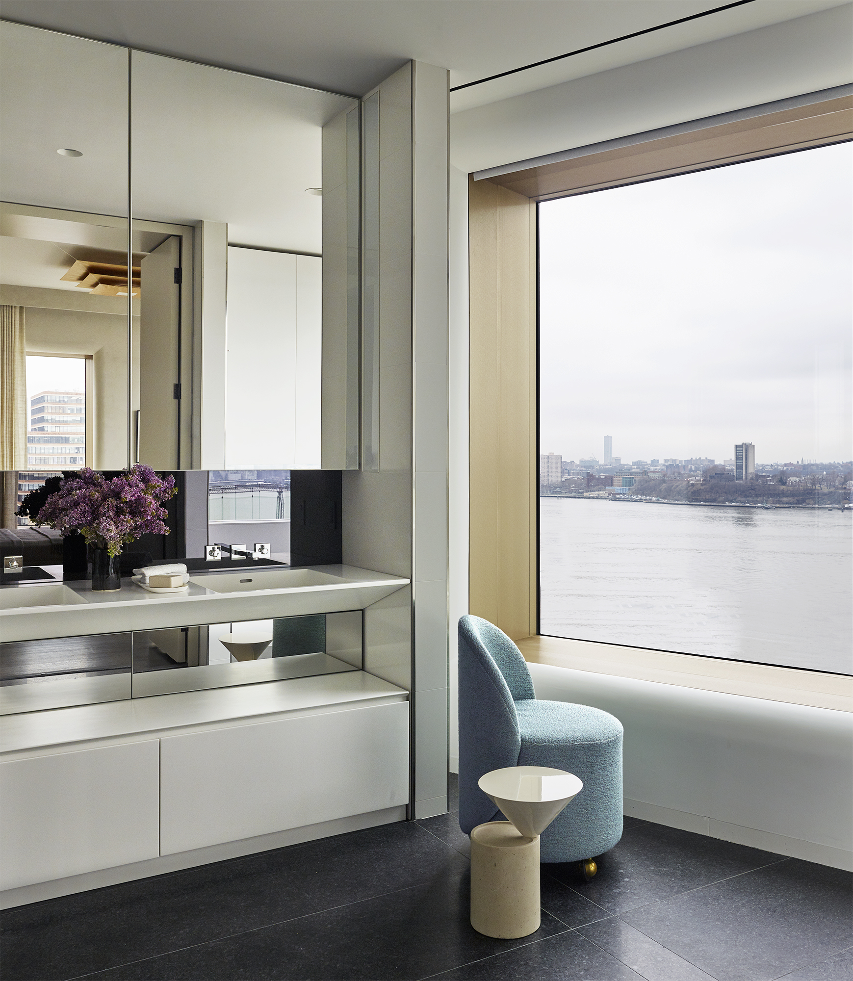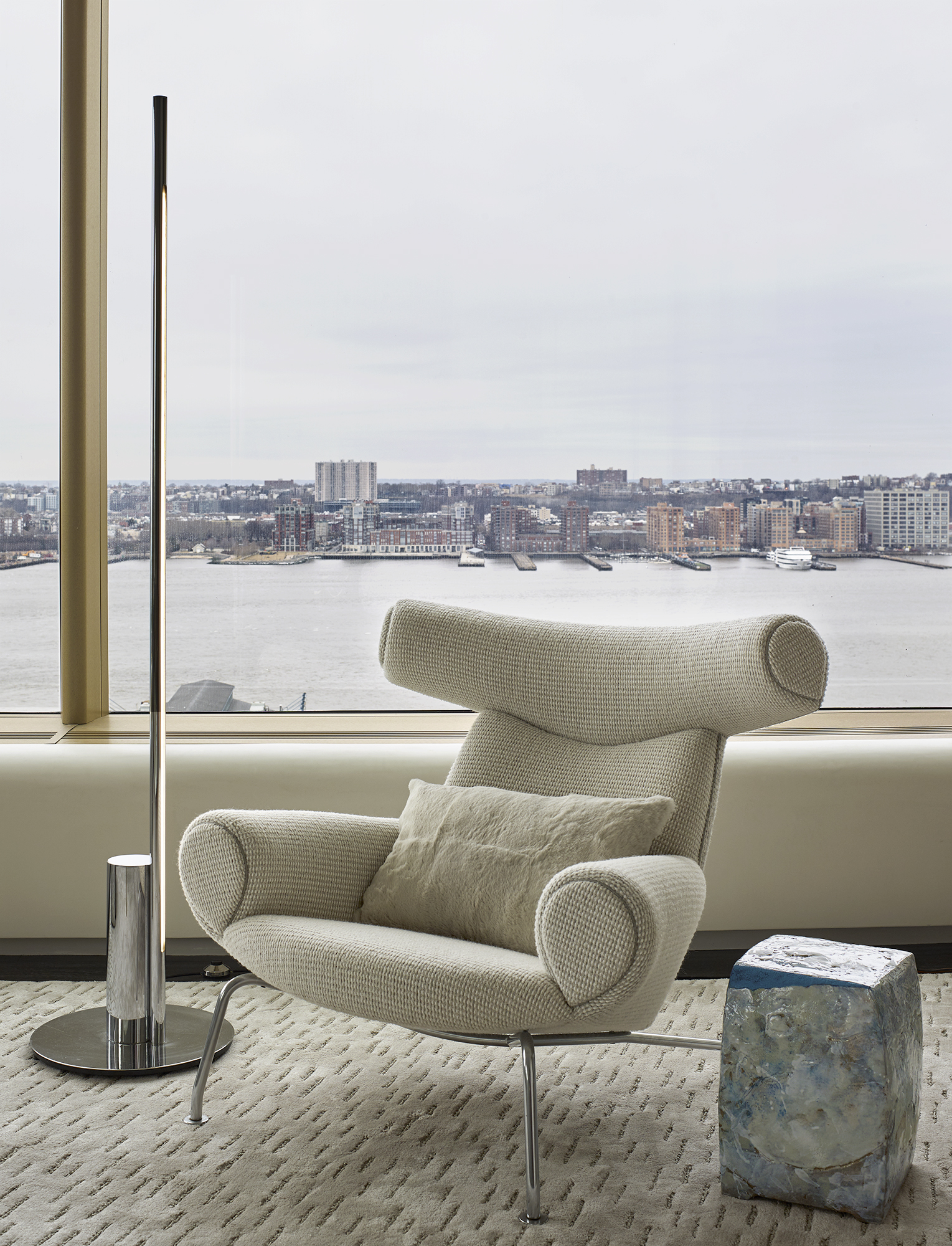 At 551 West 21st Street, GRADE created this 4,300 SF art-filled pied-à-terre and curated a collection of modern art specifically for the residence, skillfully weaving pieces into the interior design and renovation of spaces. Located on the edge of the Chelsea Arts District, inside the masterly designed residential building by Sir Norman Foster, GRADE echoes exterior architectural elements in the personalized details throughout the apartment interiors. Custom features are found in the library, dining room and gallery: upholstered wall panels, decorative display niches and a suspended, suede-wrapped canopy. Tapping into the neighborhood culture and essence, GRADE carefully selected furnishings, lighting and works of art from galleries and artists around the world to create an immersive, artful residential experience set to panoramic city views.