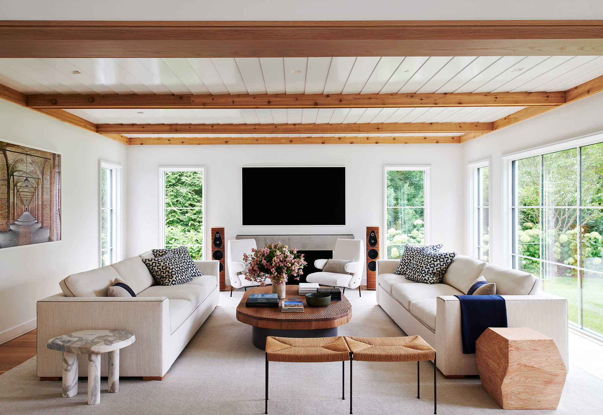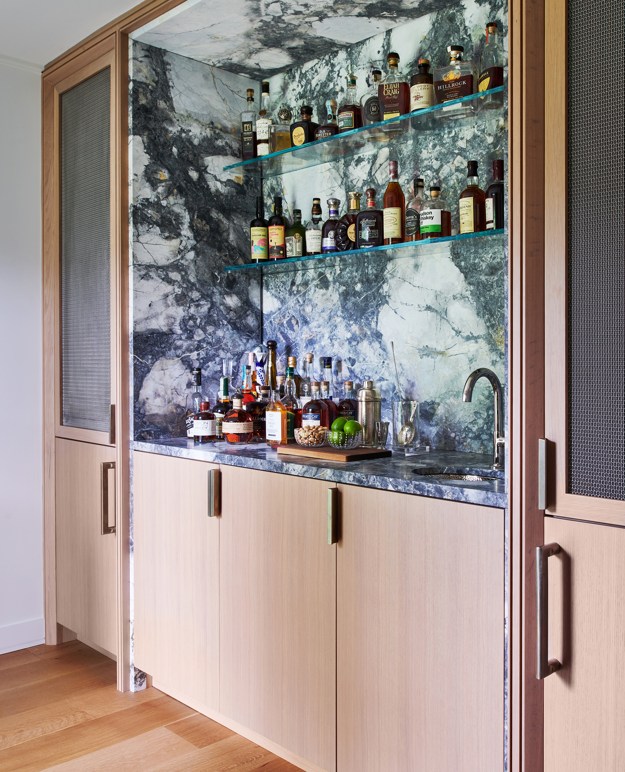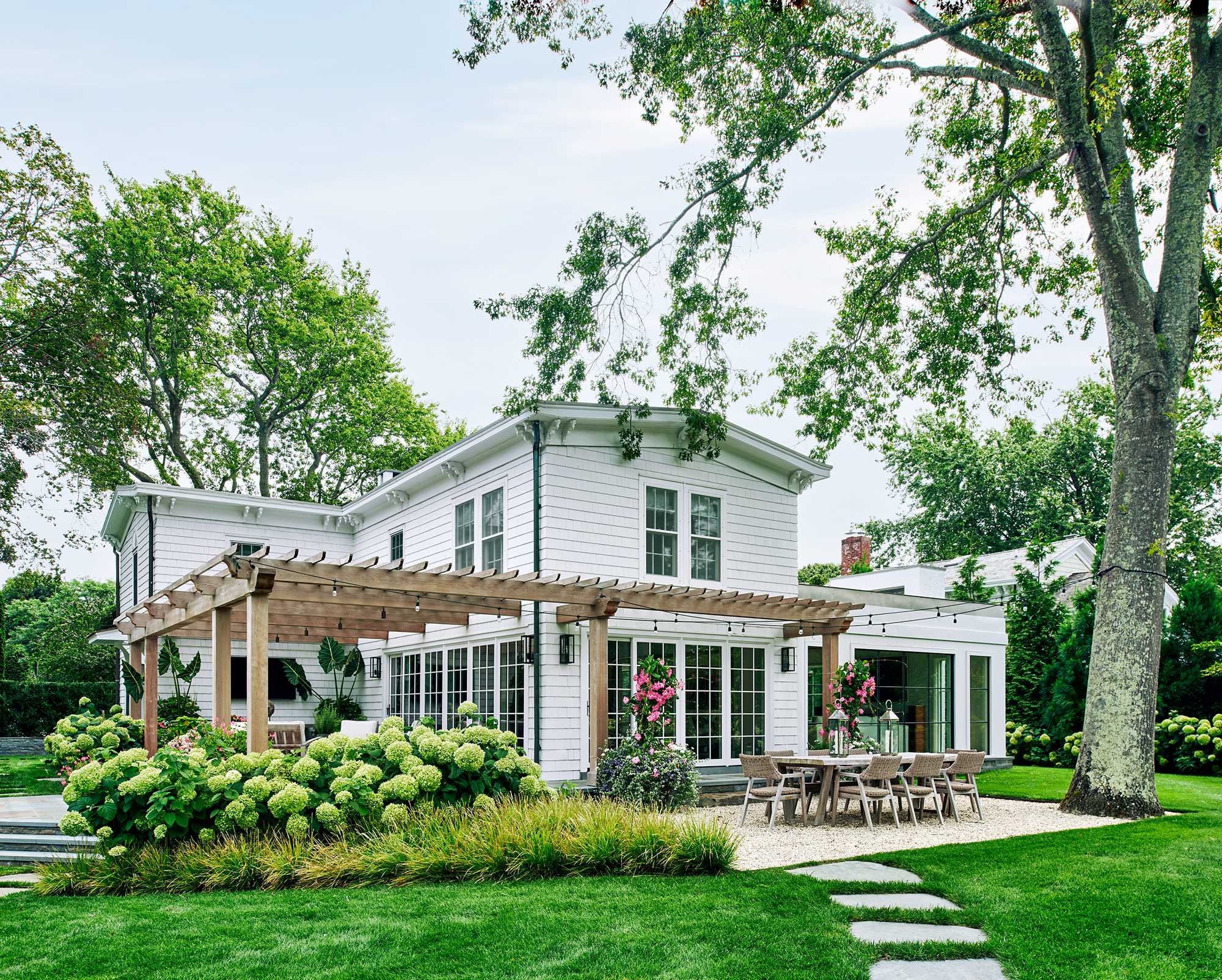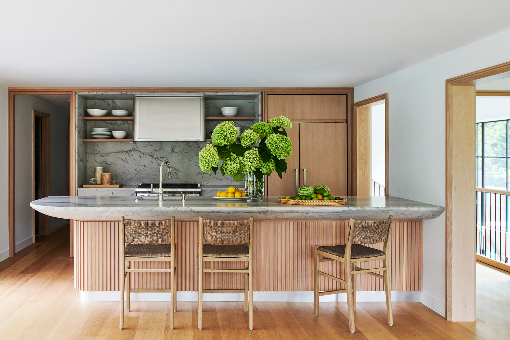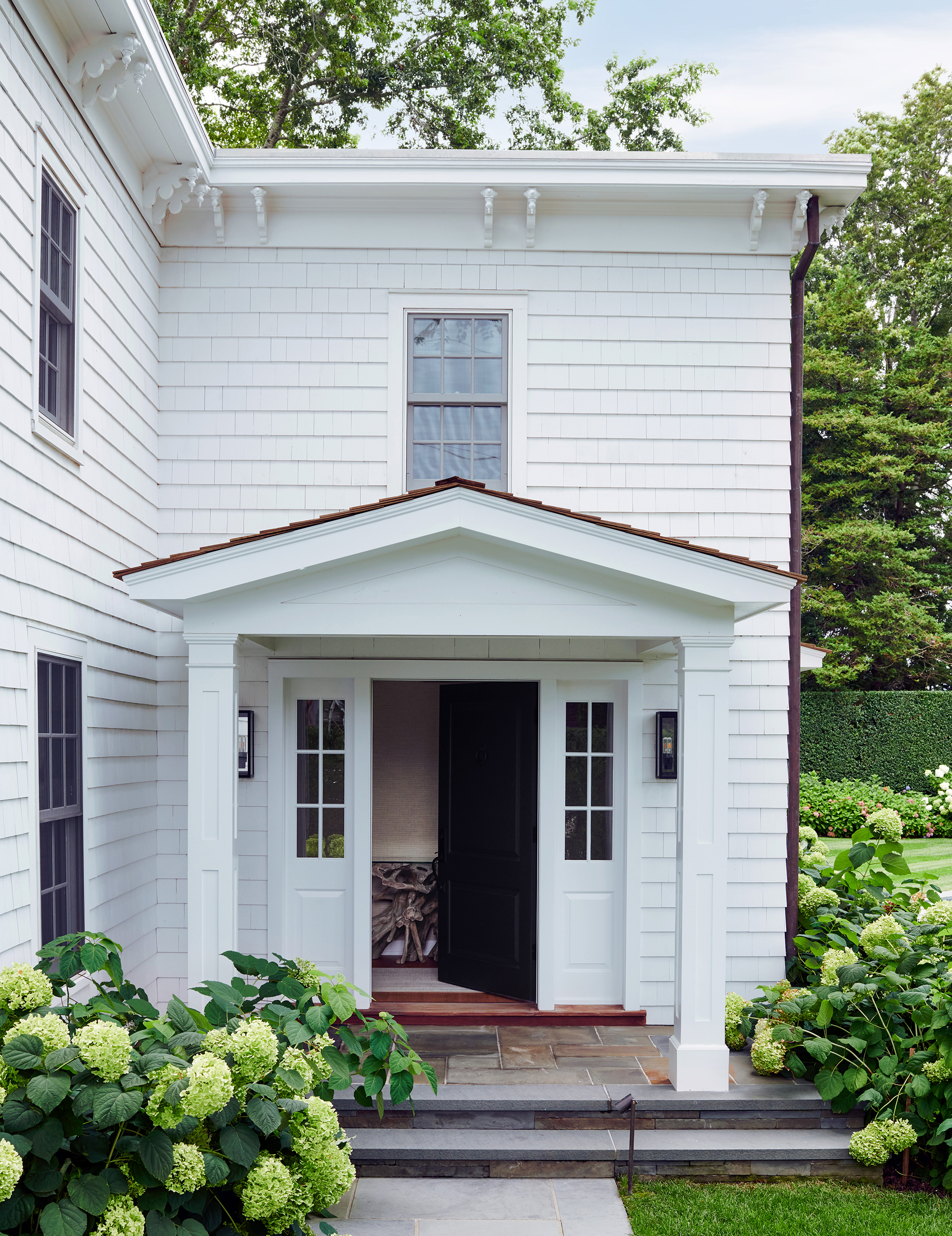 An historic Hamptons home received a contemporary renovation and addition following the relocation of the original house—built in 1847 and first renovated circa 1900s—to its new site in Bridgehampton. The rear addition bridges 19th-century and contemporary architectures on the exterior, seamlessly preserving the scale and sensibility of the existing home while skillfully expanding its footprint and infusing a cozy, Hamptons-inspired concept throughout the interiors to bring this home into the 21st century. Select areas were redesigned and programmed for a modern family lifestyle including the kitchen with a new center island and appliances hidden behind seamless millwork, primary and guest baths, newly designed media room, golf simulator, and a custom, coordinated bar and storage for a vinyl collection. Low ceiling heights on the first and second floors were opened through this expansion with a double height atrium and spiral staircase joining new and existing sections. The curvature of the stair, among other details, references design details of marine vessels, while a soft palette of stone and wood breathes new life into spaces.