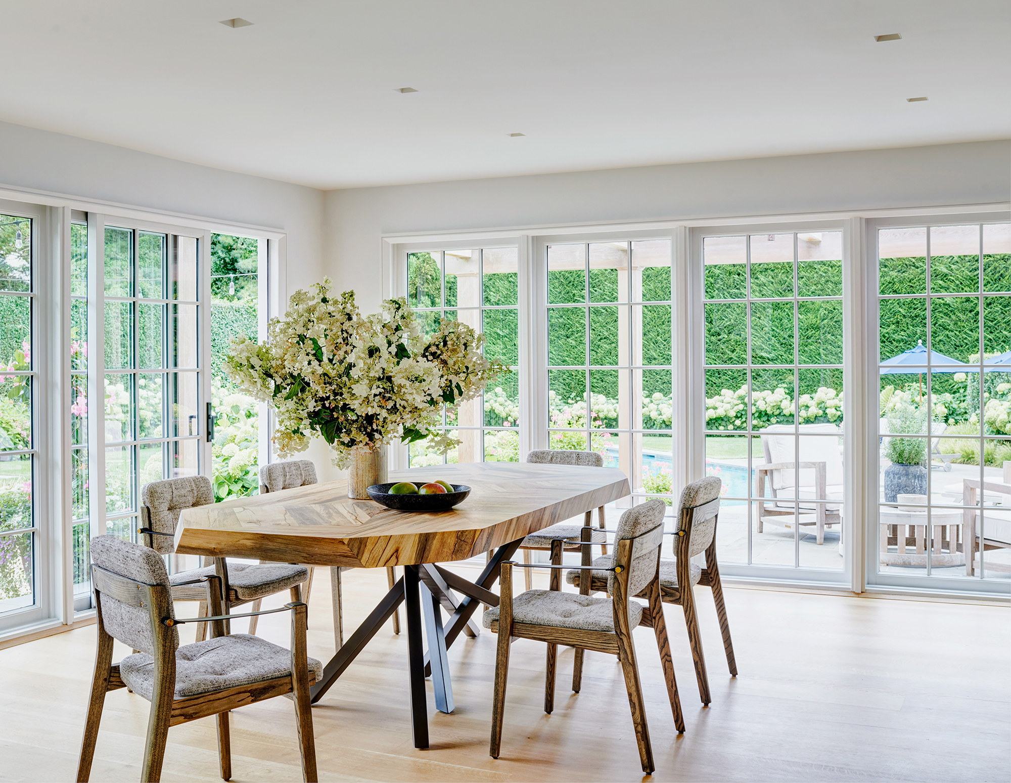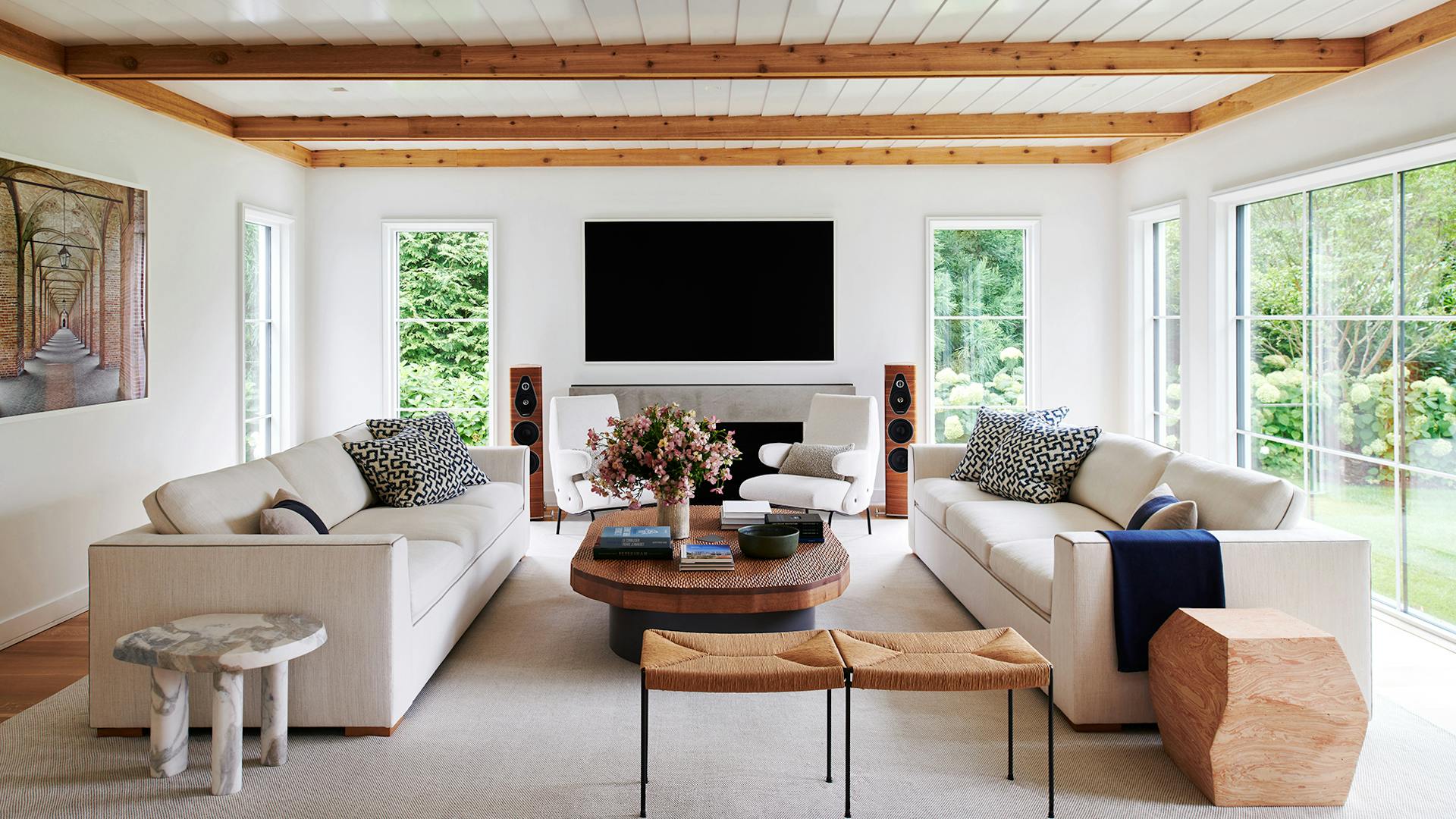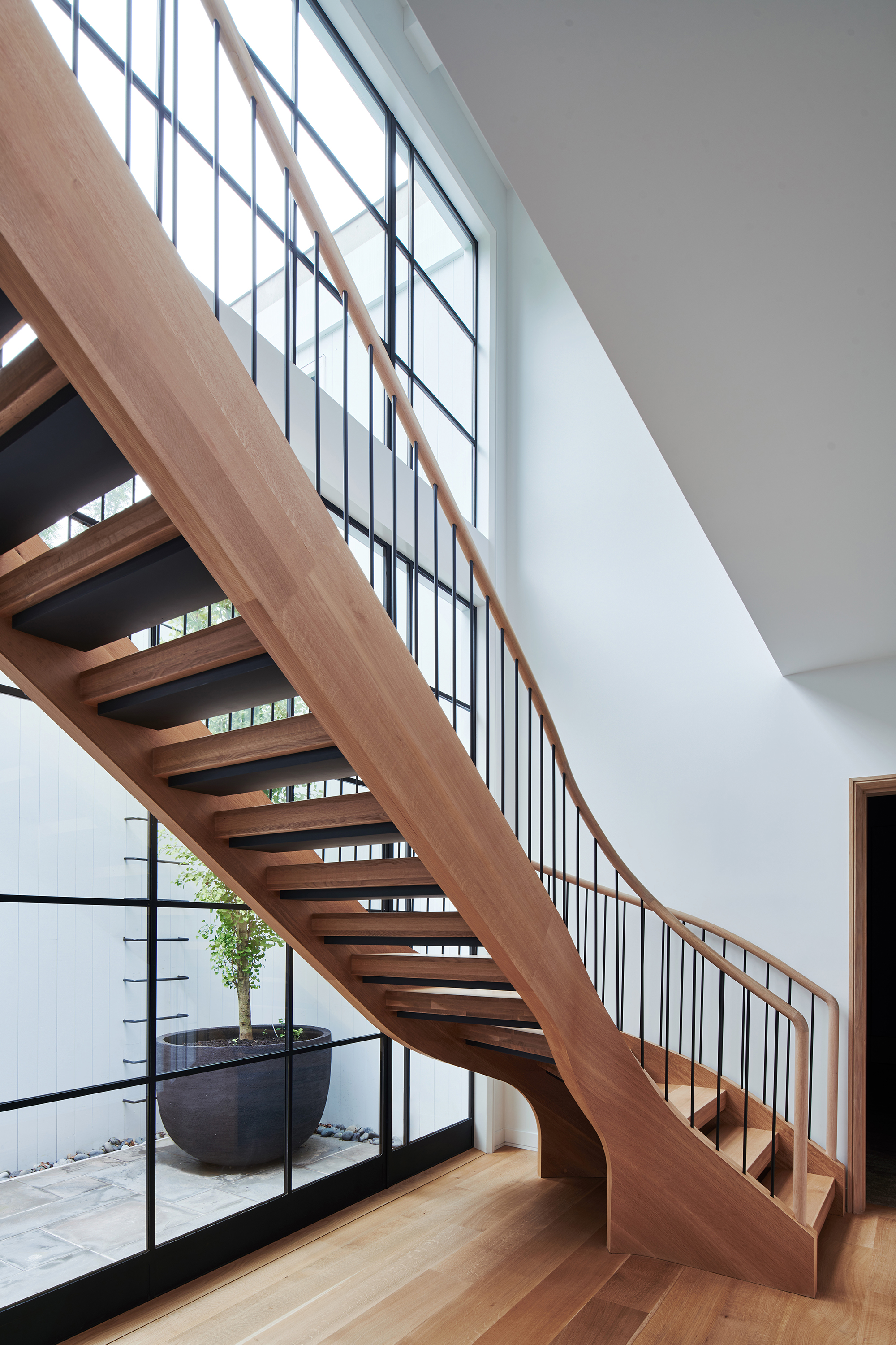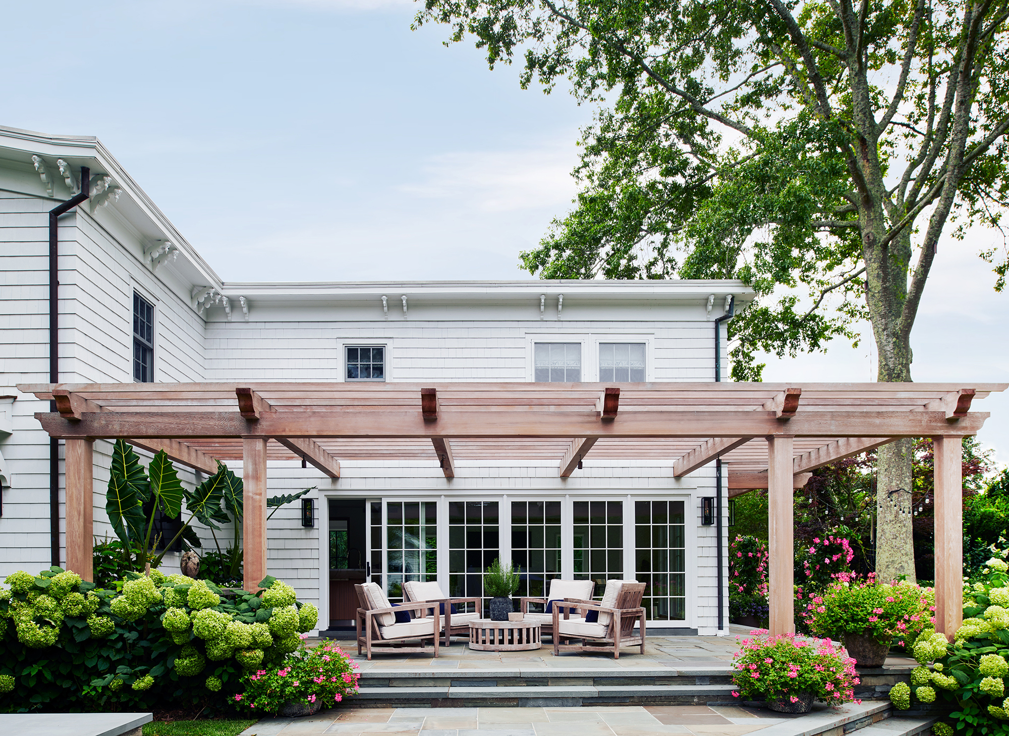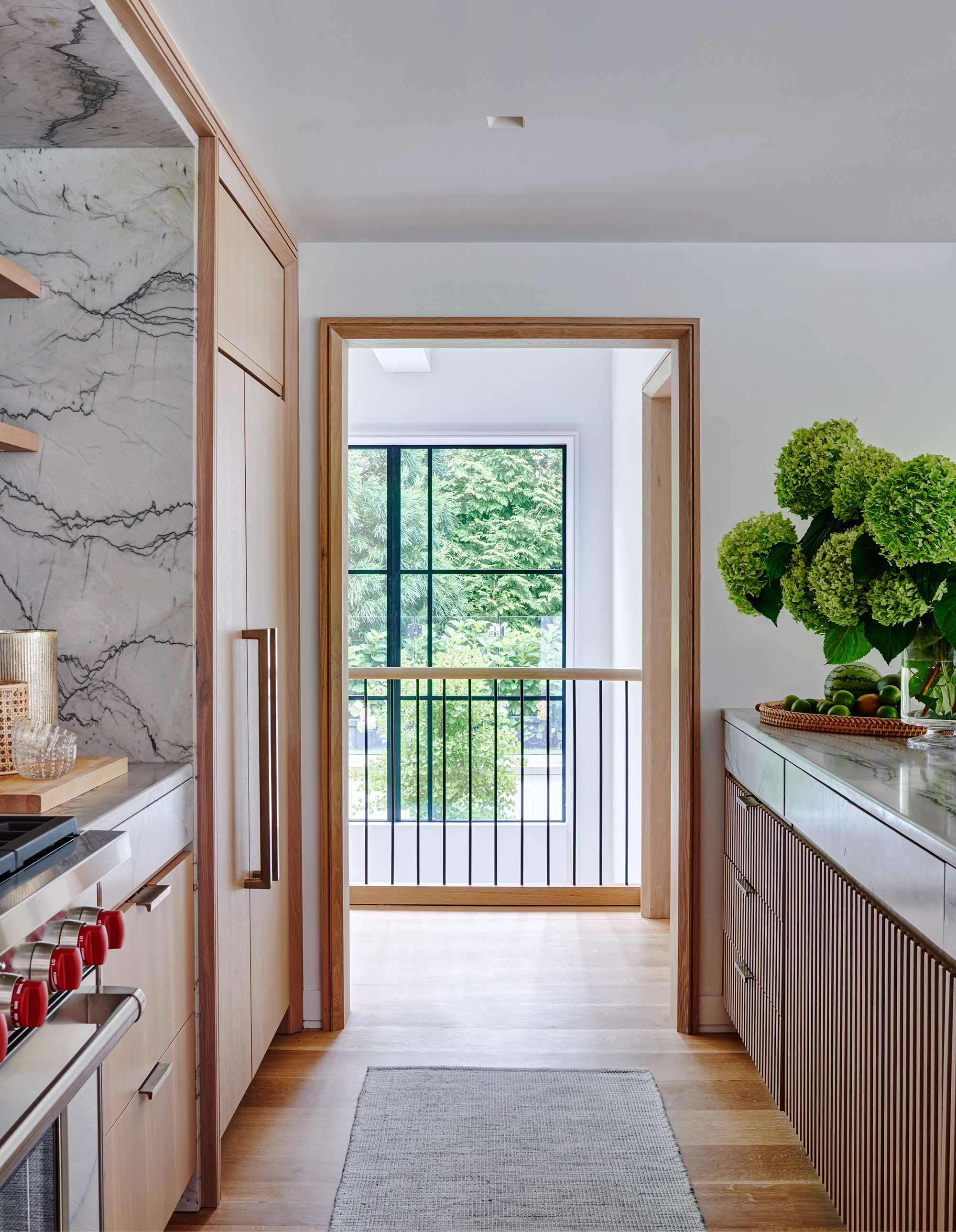 An historic Hamptons home received a contemporary renovation and addition following the relocation of the original house—built in 1847 and first renovated circa 1900s—to its new site in Bridgehampton. The rear addition bridges 19th-century and contemporary architectures on the exterior, seamlessly preserving the scale and sensibility of the existing home while skillfully expanding its footprint and infusing a cozy, Hamptons-inspired concept throughout the interiors to bring this home into the 21st century. Select areas were redesigned and programmed for a modern family lifestyle including the kitchen with a new center island and appliances hidden behind seamless millwork, primary and guest baths, newly designed media room, golf simulator, and a custom, coordinated bar and storage for a vinyl collection. Low ceiling heights on the first and second floors were opened through this expansion with a double height atrium and spiral staircase joining new and existing sections. The curvature of the stair, among other details, references design details of marine vessels, while a soft palette of stone and wood breathes new life into spaces.