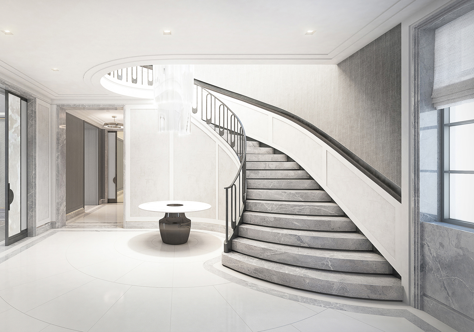 GRADE’s Classically Modern Townhouse is an extensive interior architecture and decorating project spanning 9,300 SF over four floors of a newly constructed, single-family home. The interior design, fixtures and materials will be luxurious, sophisticated and minimal. GRADE’s take on classical modern will reveal a soft palette with dark accents, blending sumptuous natural stones, white oak, eucalyptus wood and etched glass with metal details and reveals throughout. Furnishings will be modern, juxtaposing clean, geometric forms with softer, curvaceous pieces. This balance creates a soothing environment and perfect backdrop for bolder decorative elements to take center stage—once such moment will present a dramatic focal point within the circular entry stair with a crystalline comet chandelier by Stuart Haygarth.