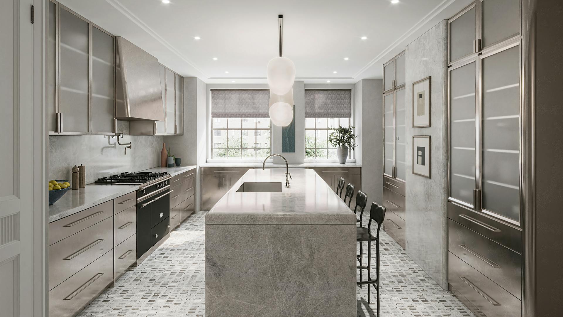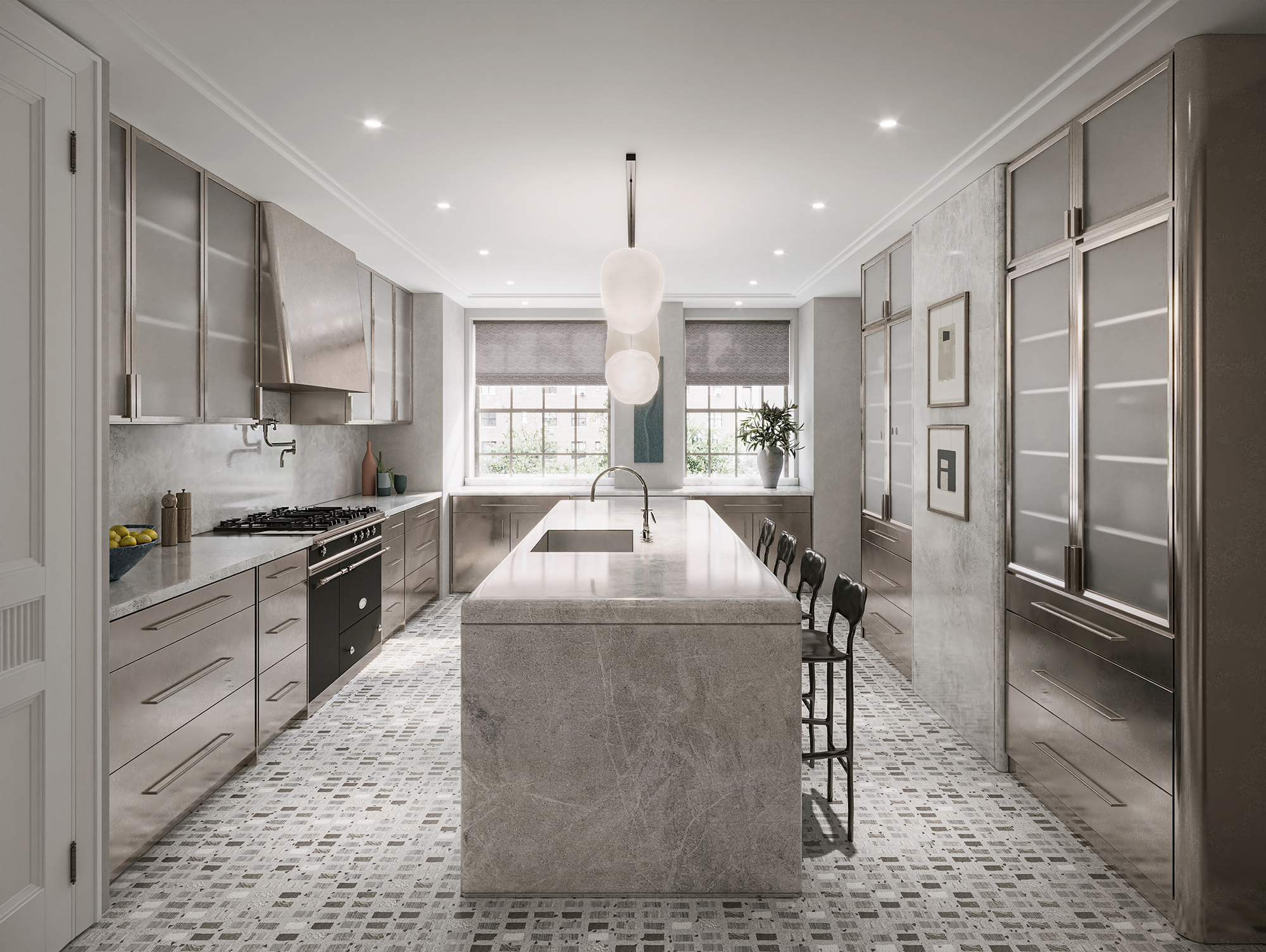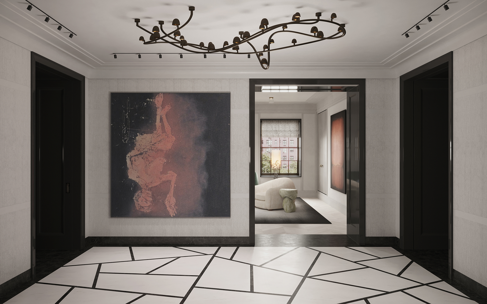 At the Park Avenue Residence, GRADE redesigned a 3,800 SF apartment inside an historic building on the Upper East Side as an overflow space for family recreation—just an elevator ride away from the family’s main residence at the same address. A full gut renovation, this apartment was redesigned primarily for hosting and entertaining with the addition of a new dining room, private study for working from home, and an elegant guest bedroom at the ready for impromptu visitors. Interiors will be a contemporary take on classic Upper East Side traditional with an artistic vision for each area, articulated through refined, contemporary furnishings and bespoke finishes. Muted hues are interspersed throughout a predominantly monochromatic scheme, juxtaposing striking black lacquer and stained wood with a light, textured palette of white, cream, and grey. Artistic glass is a special focus, paired with patinated metal detailing and strong stone elements to create elegant but impactful moments. Existing rooms were transformed and incorporated into a more harmonious plan to support a stellar home entertaining environment. A new study and expanded guest bedroom occupy one wing for private family use, and the second public wing is comprised of a grand living room with terrace which connects to the new entry gallery and dining room, chef’s kitchen, and staff bedroom.