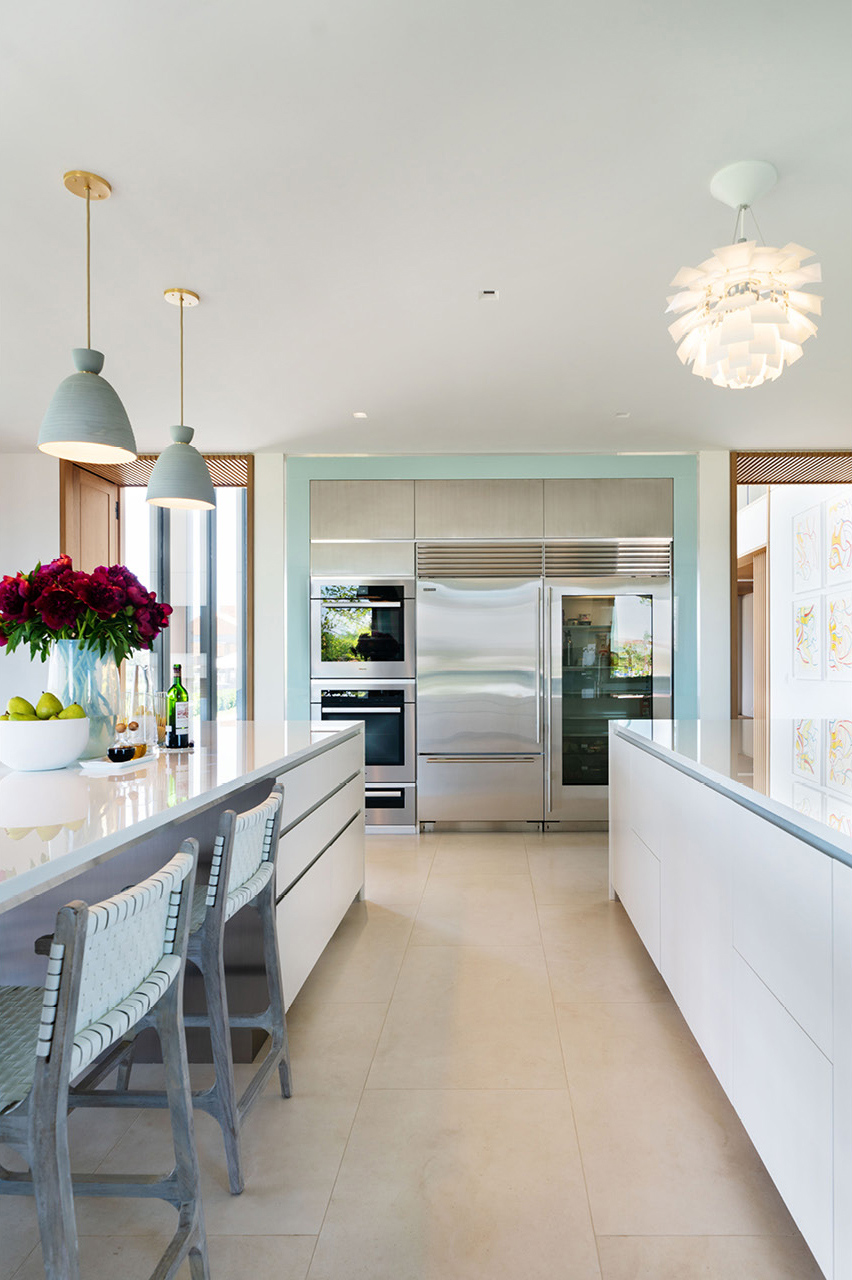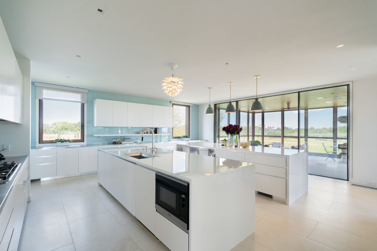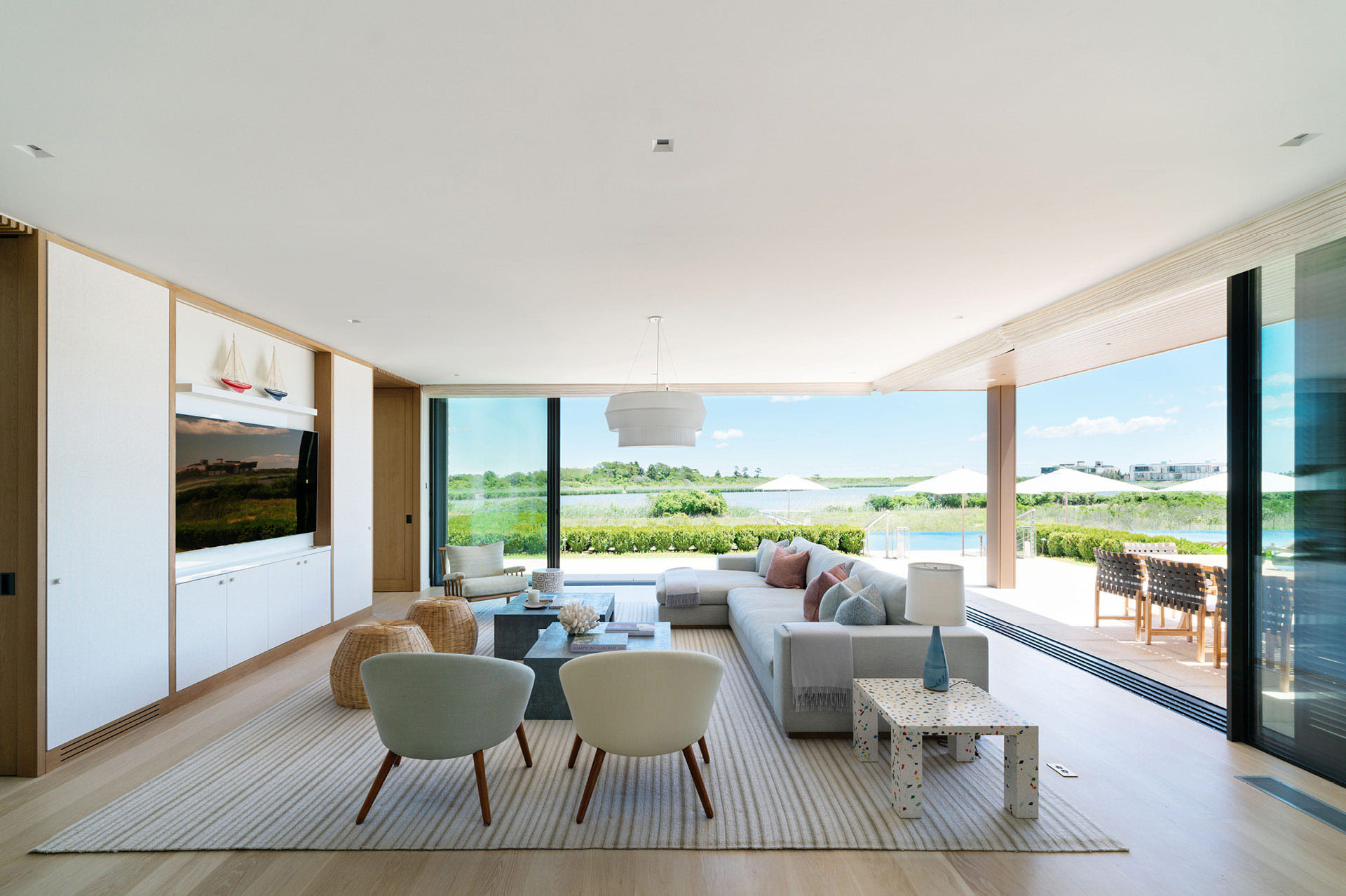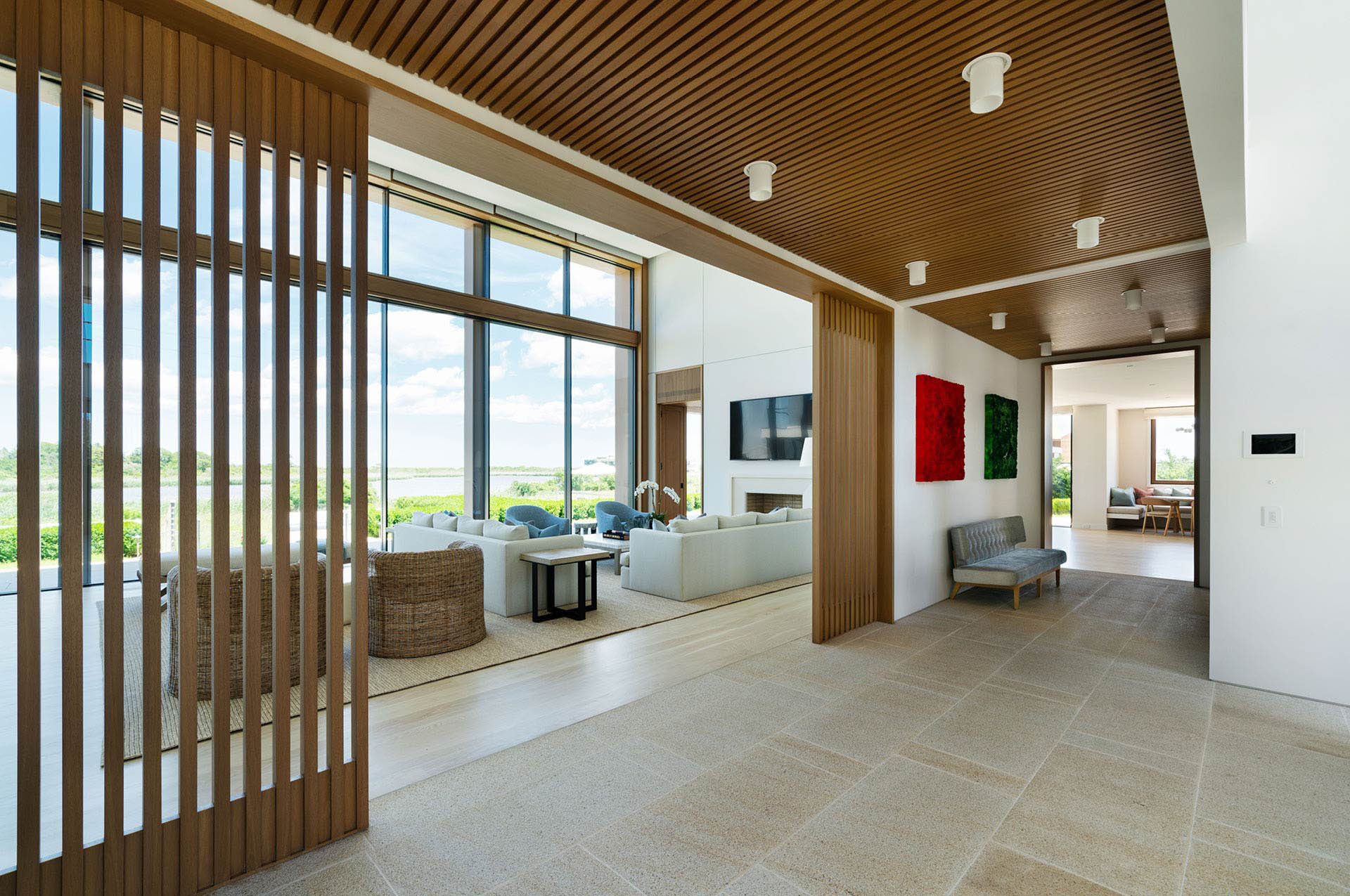 The Shutter House is a 13,500 SF modern home designed to evoke an understated sense of luxury through the blending of traditional and contemporary styles. A calm. comforting palette features natural materials juxtaposed with modern silhouettes in soft, cream fabrics along with ethereal stone and custom-stained wood, reminiscent of the local coastal spirit. The architectural focus of this home accentuates light, air and views of the surrounding landscape through the dramatic double-height living and dining areas framed by floor-to-ceiling windows spanning much of the rear façade to create a seamless indoor-outdoor experience.