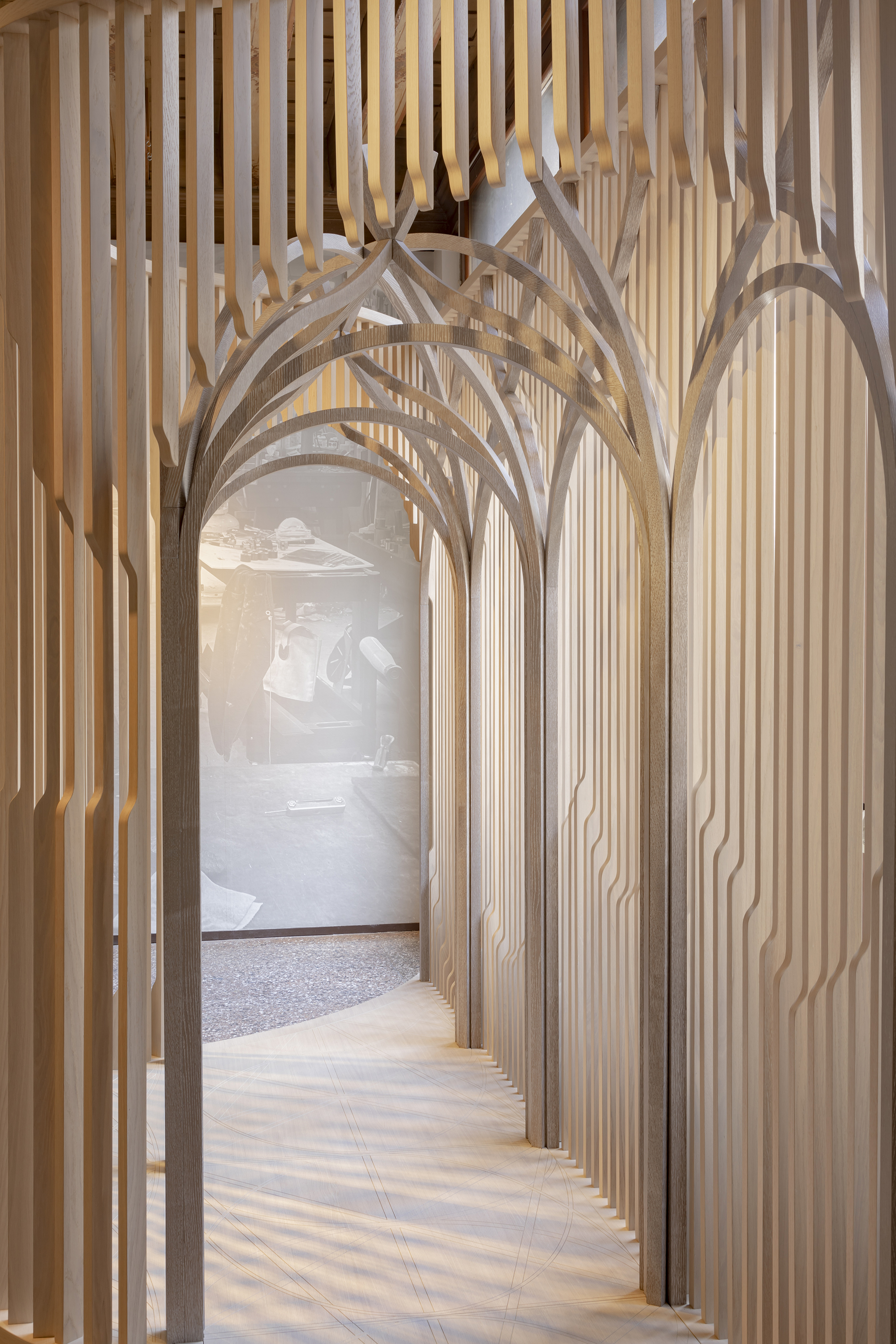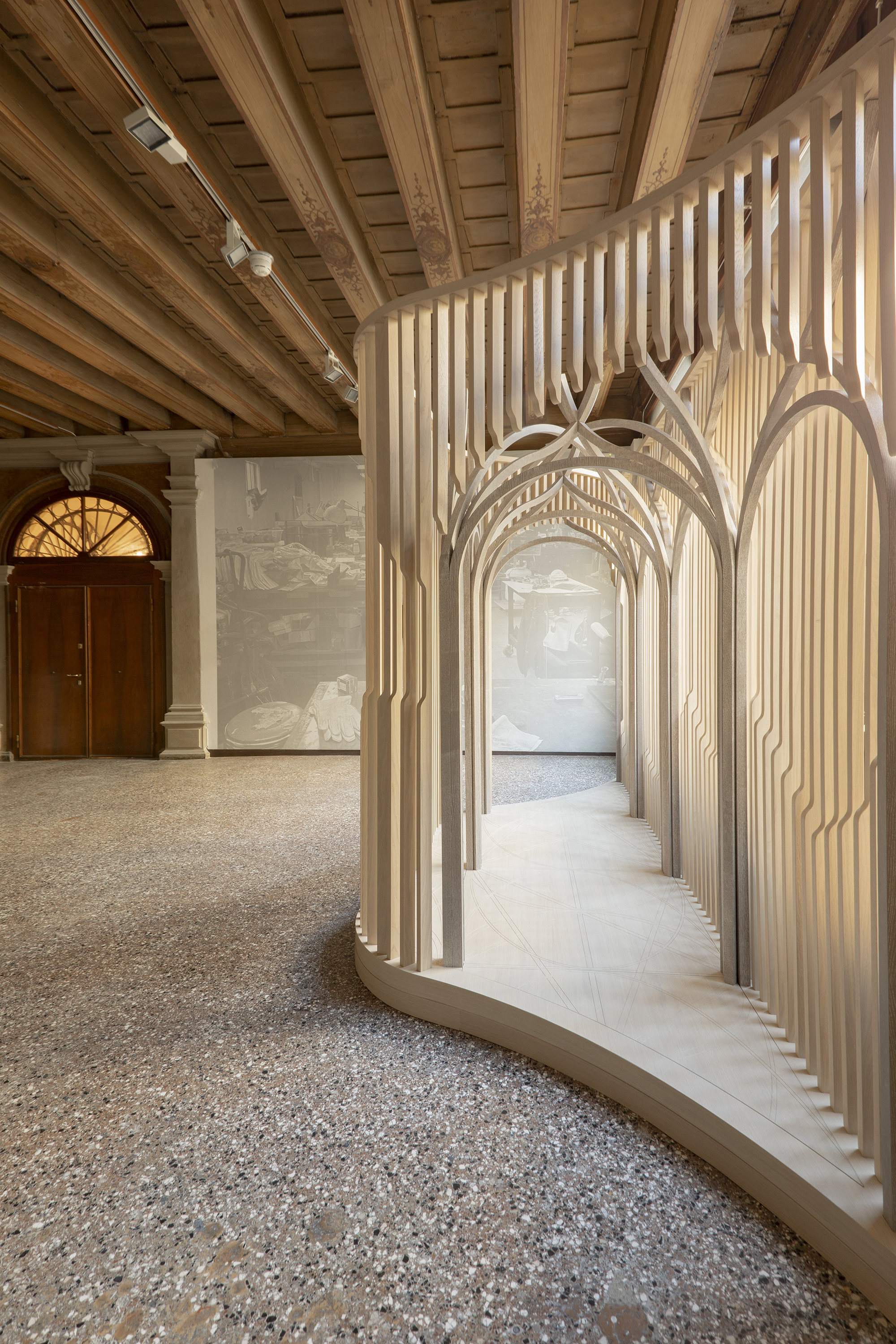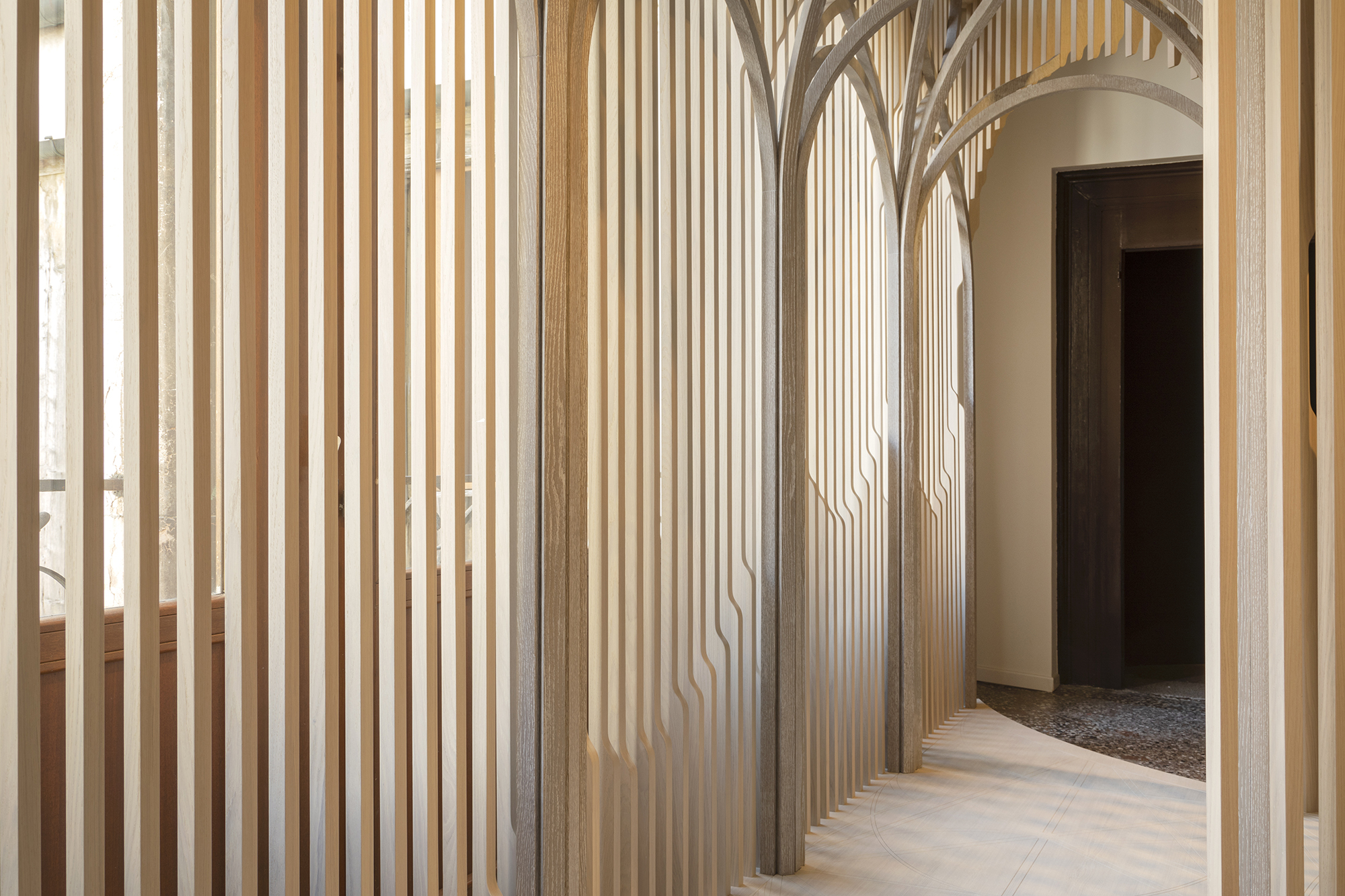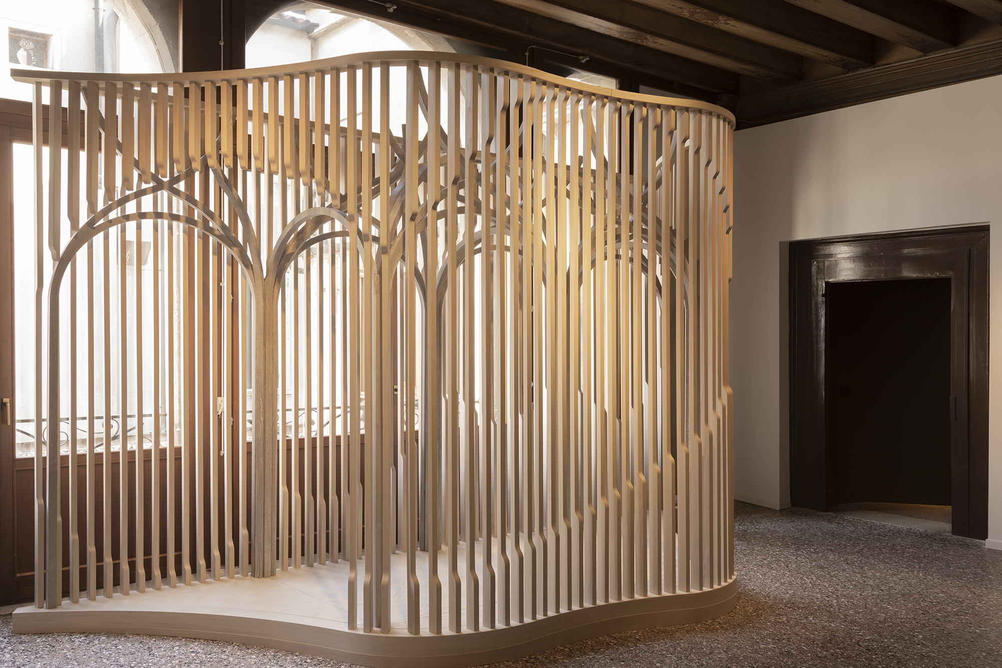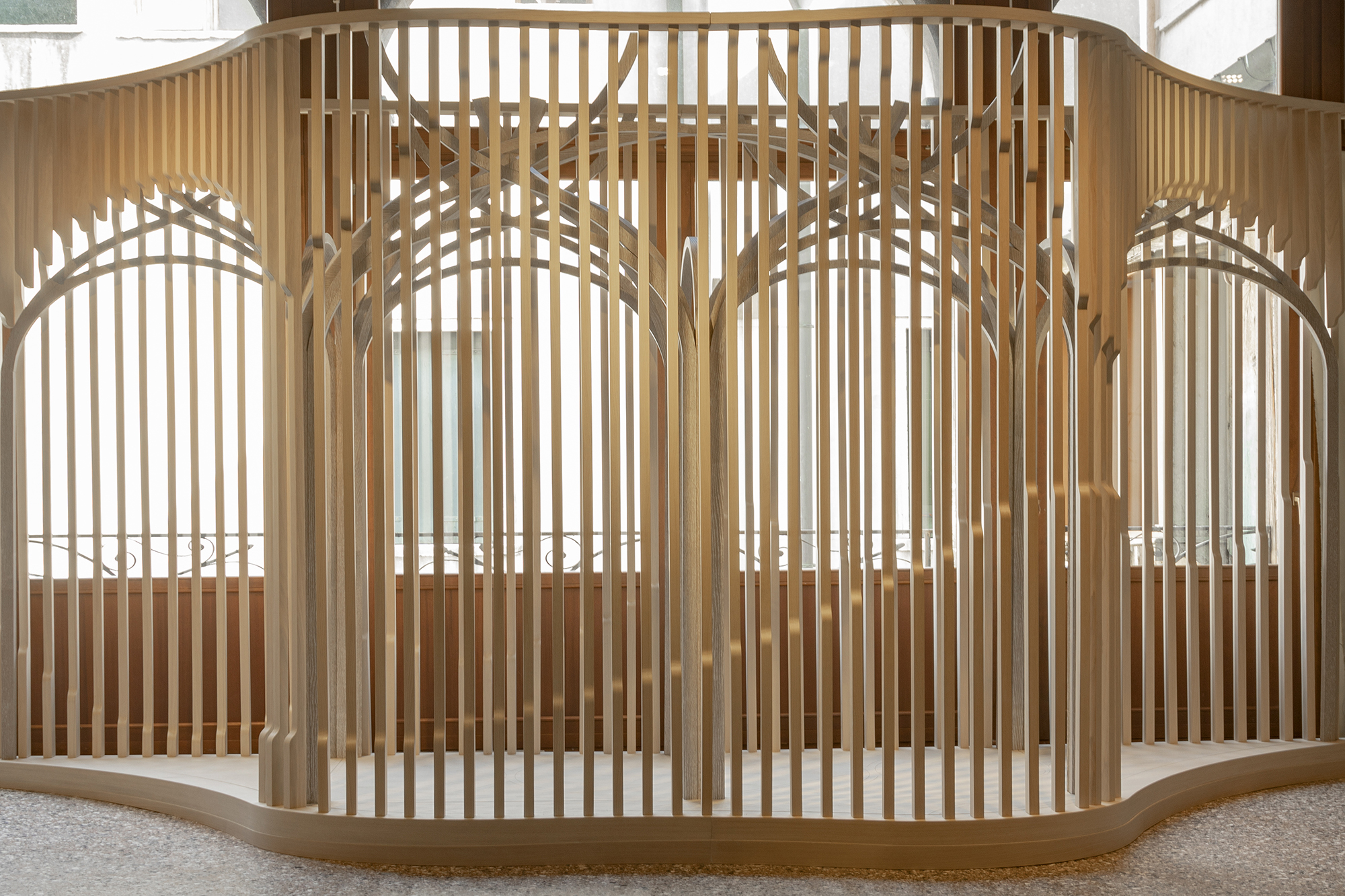 GRADE's architecture installation for the 2021 Venice Biennale Exhibition reflects the theme of “Time Space Existence" within a contemporary realization of space and a visual metaphor for some of the concepts informing our work and process. Our installation embodies the values of our residential work within an abstract form and offers the viewer an interactive experience of timeless design via the structure and experience of moving through it. A three-dimensional framework rises up from the base where a two-dimensional diagram is etched, reflecting the origins of our design realized through a distillation of ideas and aesthetic concerns from the traditional to the modern. Against the historic Palazzo Bembo, cerused oak slats transform, undulate and converge overhead in a harmonious pattern of modern arches elegantly interpreted from classical sources.
