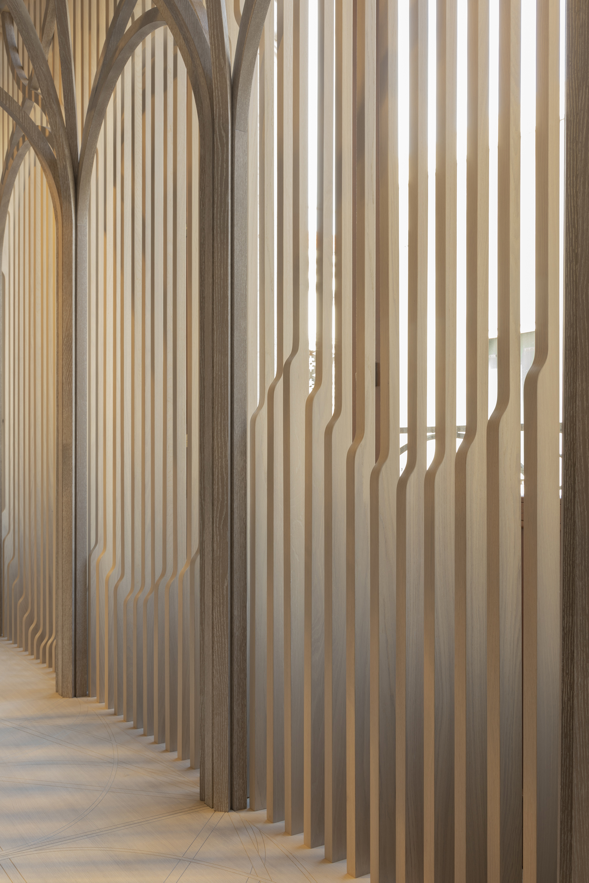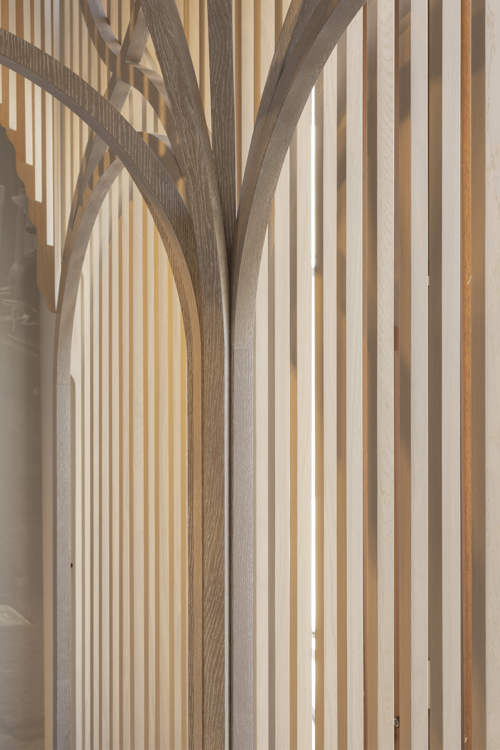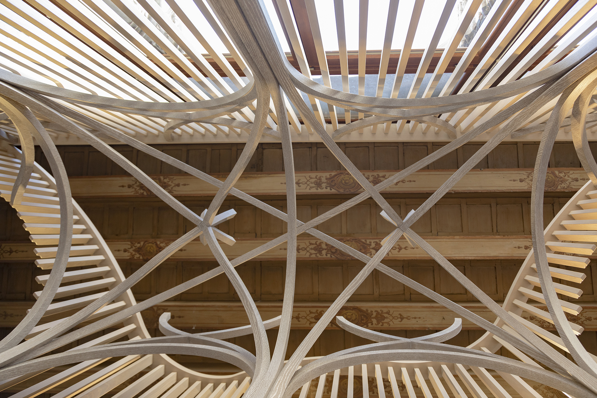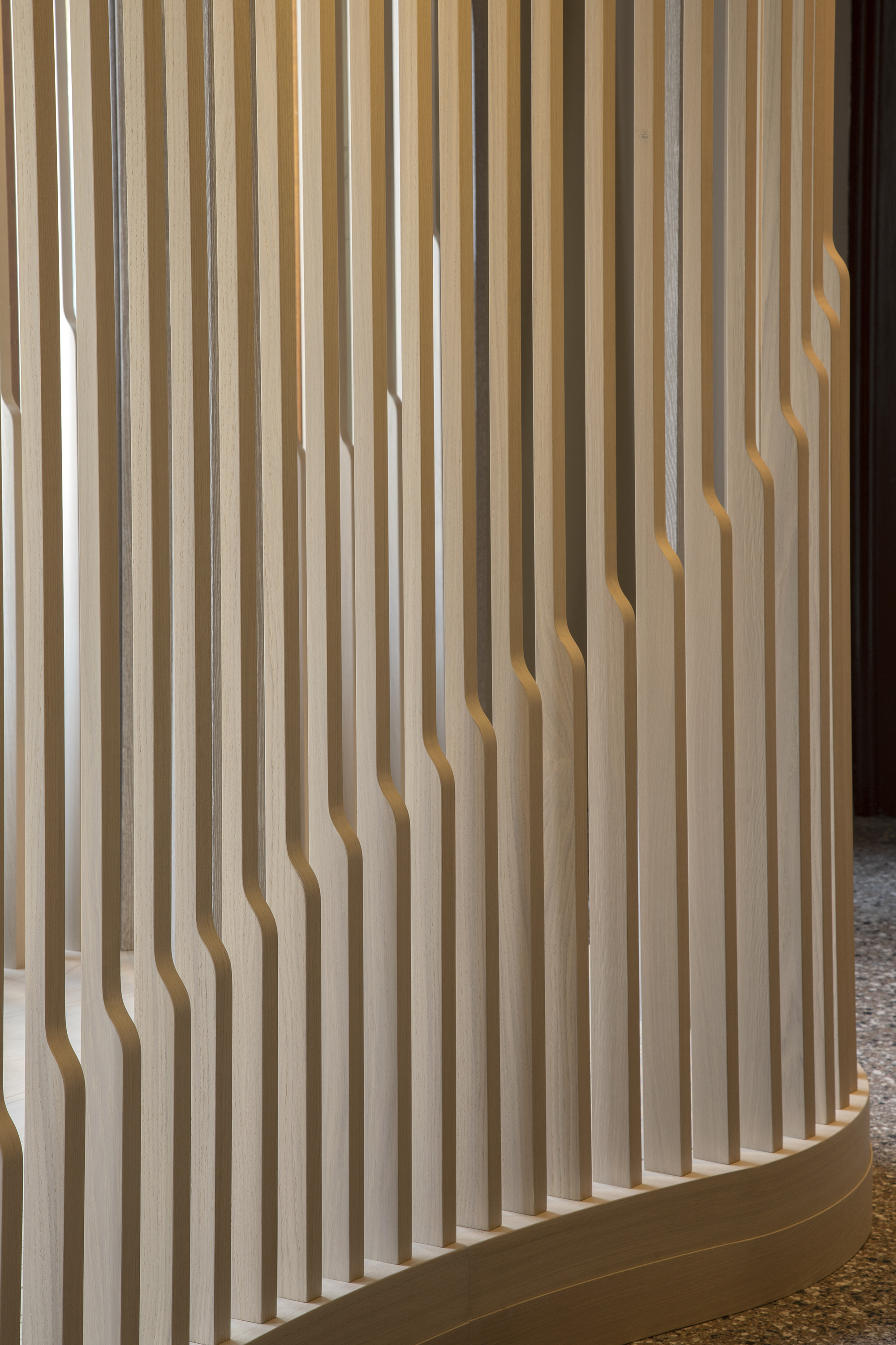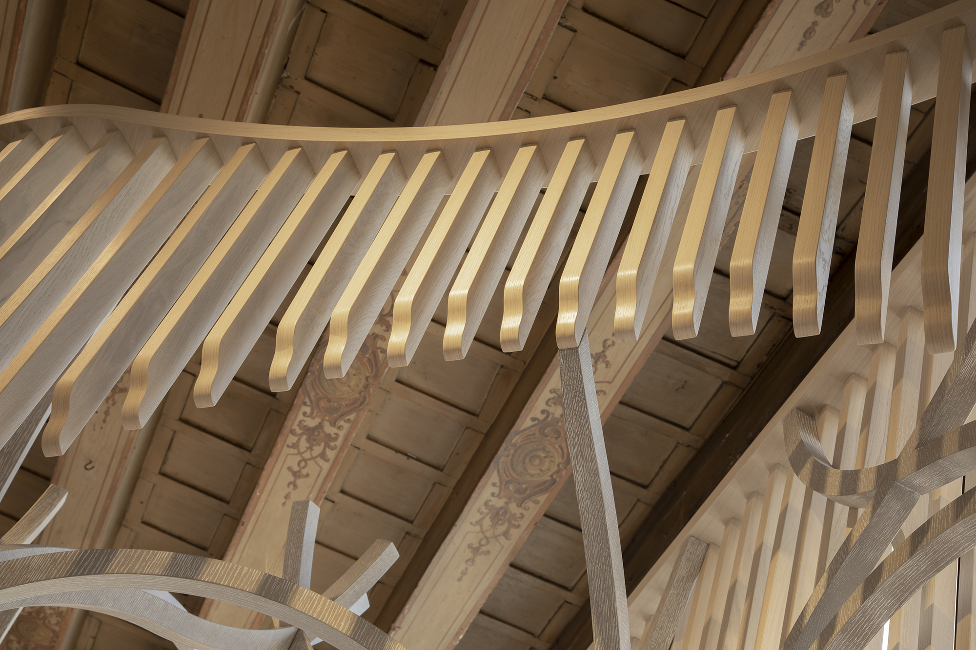 GRADE's architecture installation for the 2021 Venice Biennale Exhibition reflects the theme of “Time Space Existence" within a contemporary realization of space and a visual metaphor for some of the concepts informing our work and process. Our installation embodies the values of our residential work within an abstract form and offers the viewer an interactive experience of timeless design via the structure and experience of moving through it. A three-dimensional framework rises up from the base where a two-dimensional diagram is etched, reflecting the origins of our design realized through a distillation of ideas and aesthetic concerns from the traditional to the modern. Against the historic Palazzo Bembo, cerused oak slats transform, undulate and converge overhead in a harmonious pattern of modern arches elegantly interpreted from classical sources.