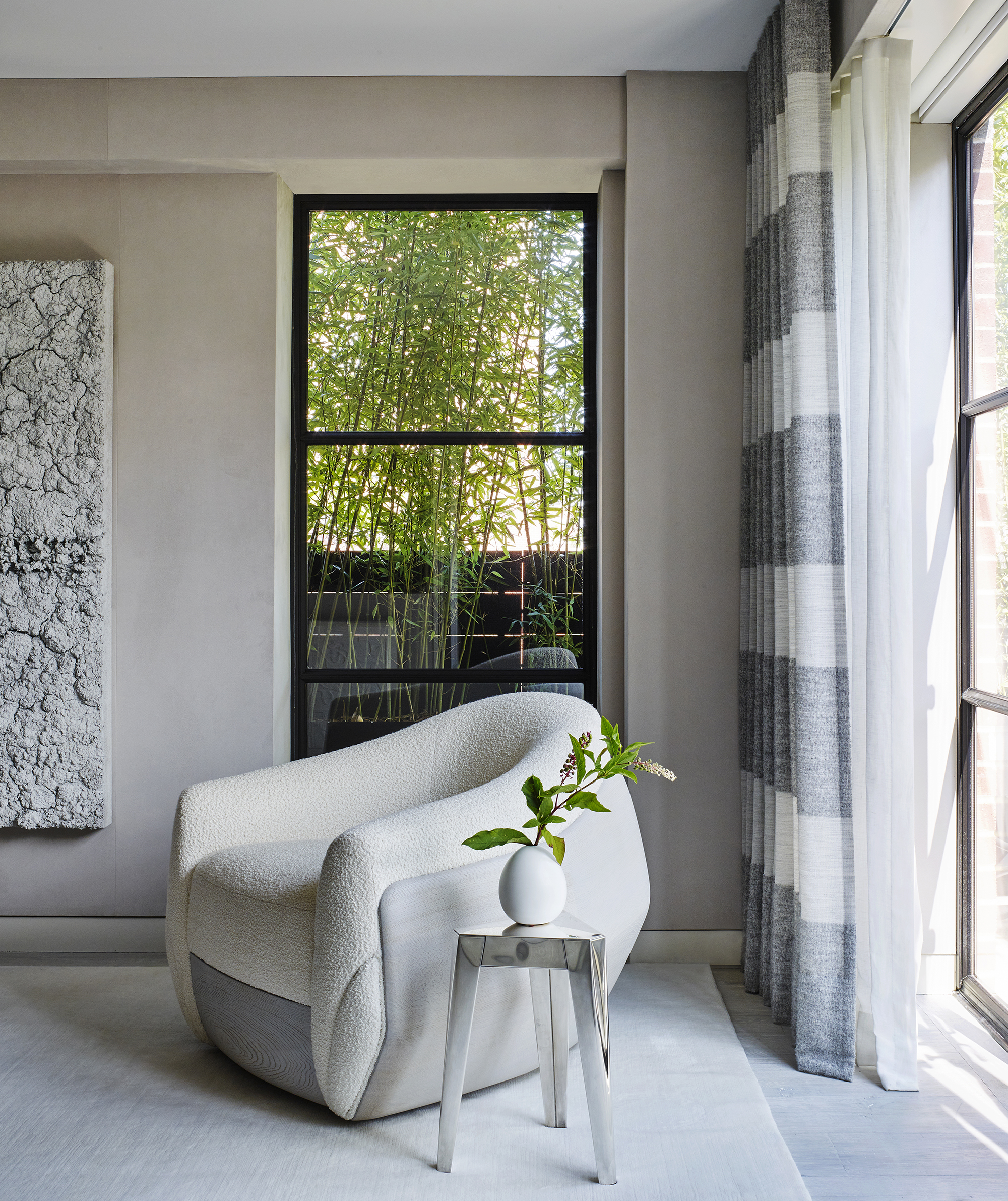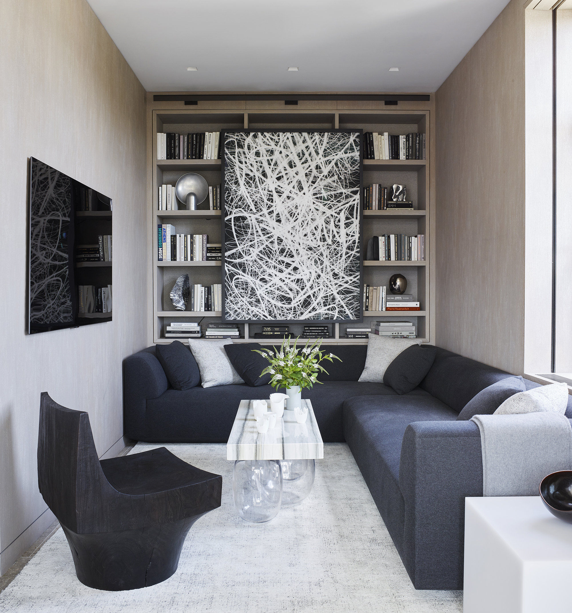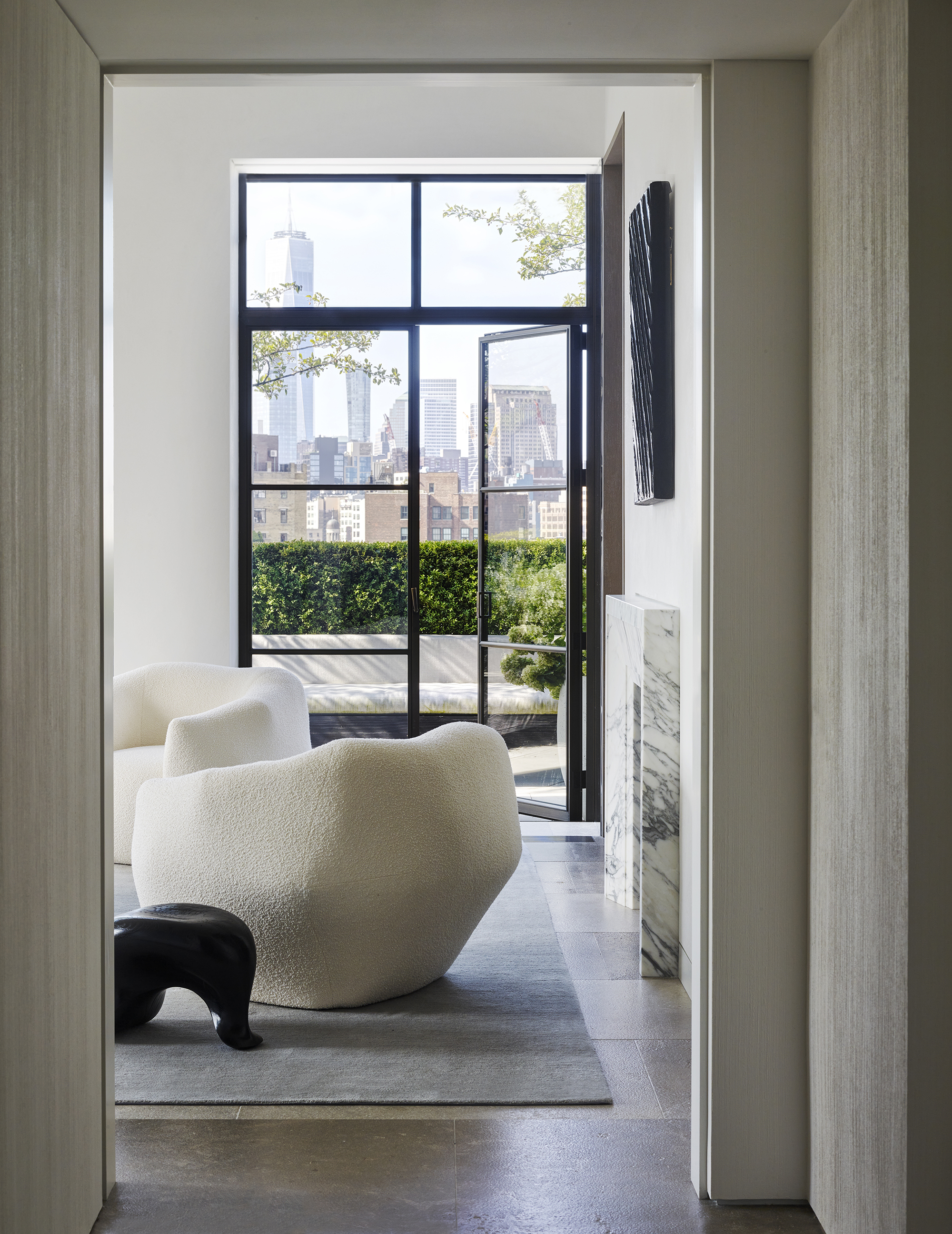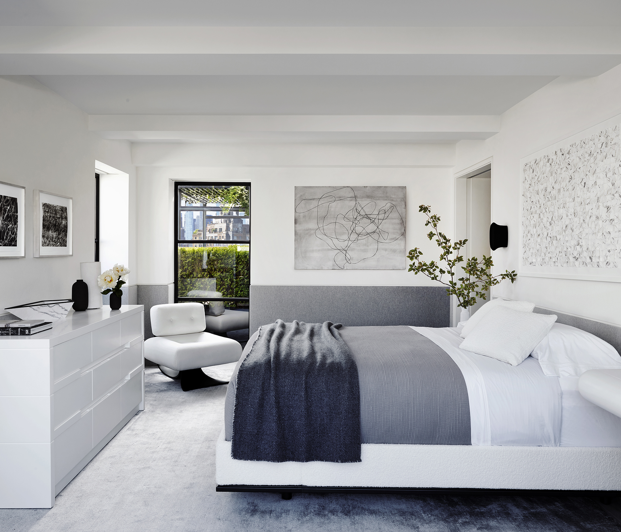 The West Village Penthouse, featured in Galerie Magazine, is a 3,800 SF, 2-bed, 3.5-bath bachelor’s residence with a wrap-around terrace designed in a monochromatic color scheme to reflect the sleek, highly tailored environment the client desired and executed to GRADE’s exacting standards of quality. In addition to a new, open plan kitchen and sleek, modern baths, architectural features and existing limestone and wood floors were refinished to create a cool, cohesive feeling throughout. Artful elements and furnishings lend graphic qualities to each space with a mix of GRADE custom, vintage and contemporary pieces by modern-day masters Eric Schmitt, Pierre Yovanovitch and Mathieu Lehanneur. GRADE’s vision and aesthetic translated the client’s preference for black, white and grey tones into rich materials, fabrics and finishes with luxurious wall treatments in Loro Piana cashmere, suede and Venetian plaster alongside cerused oak and bleached ash, infusing texture and warmth throughout. A curated art collection completes the vision, adding measured splashes of color in works by George Condo, Pat Steir, Glenn Ligon, Richard Prince and Pierre Soulages—bringing this home to life.