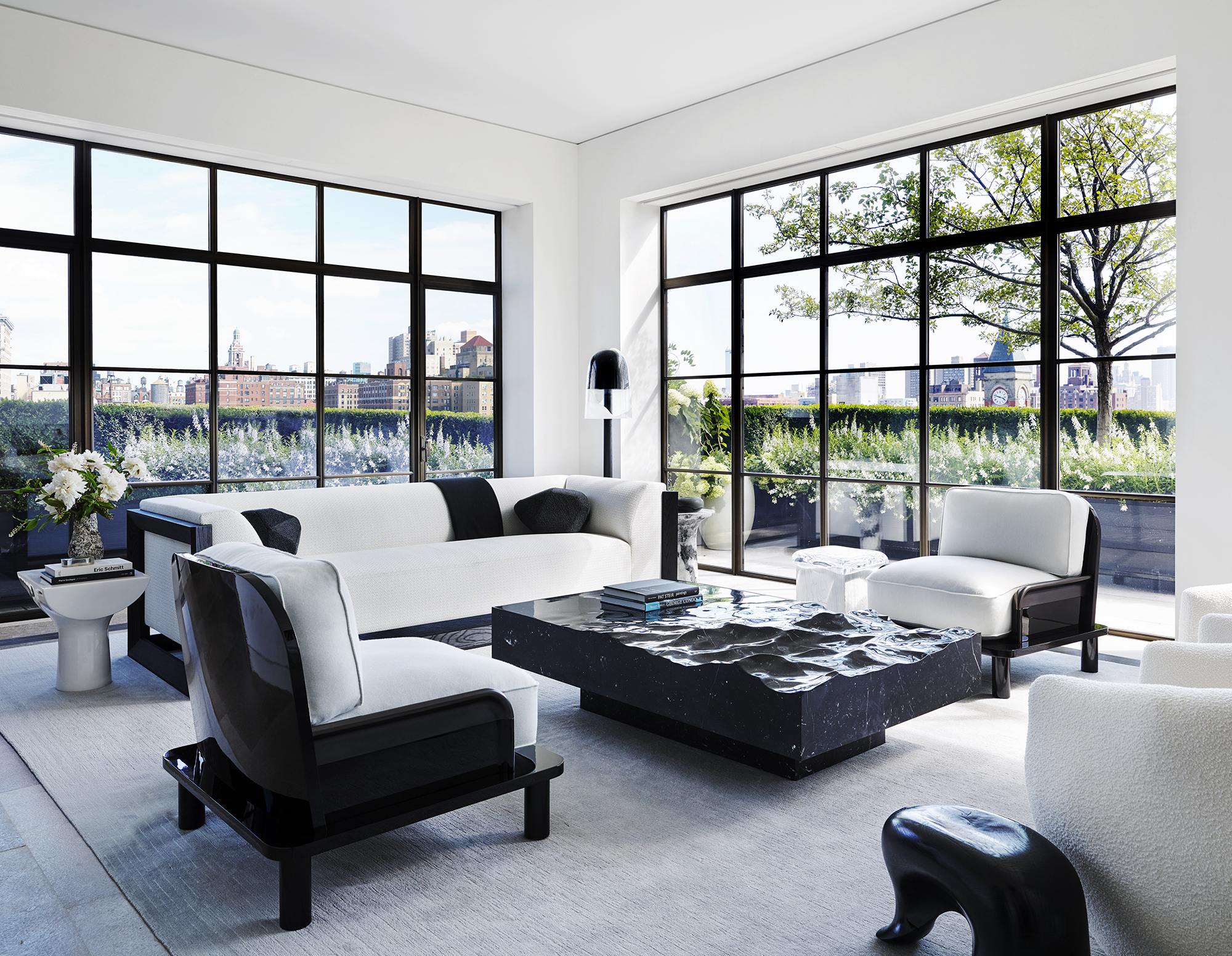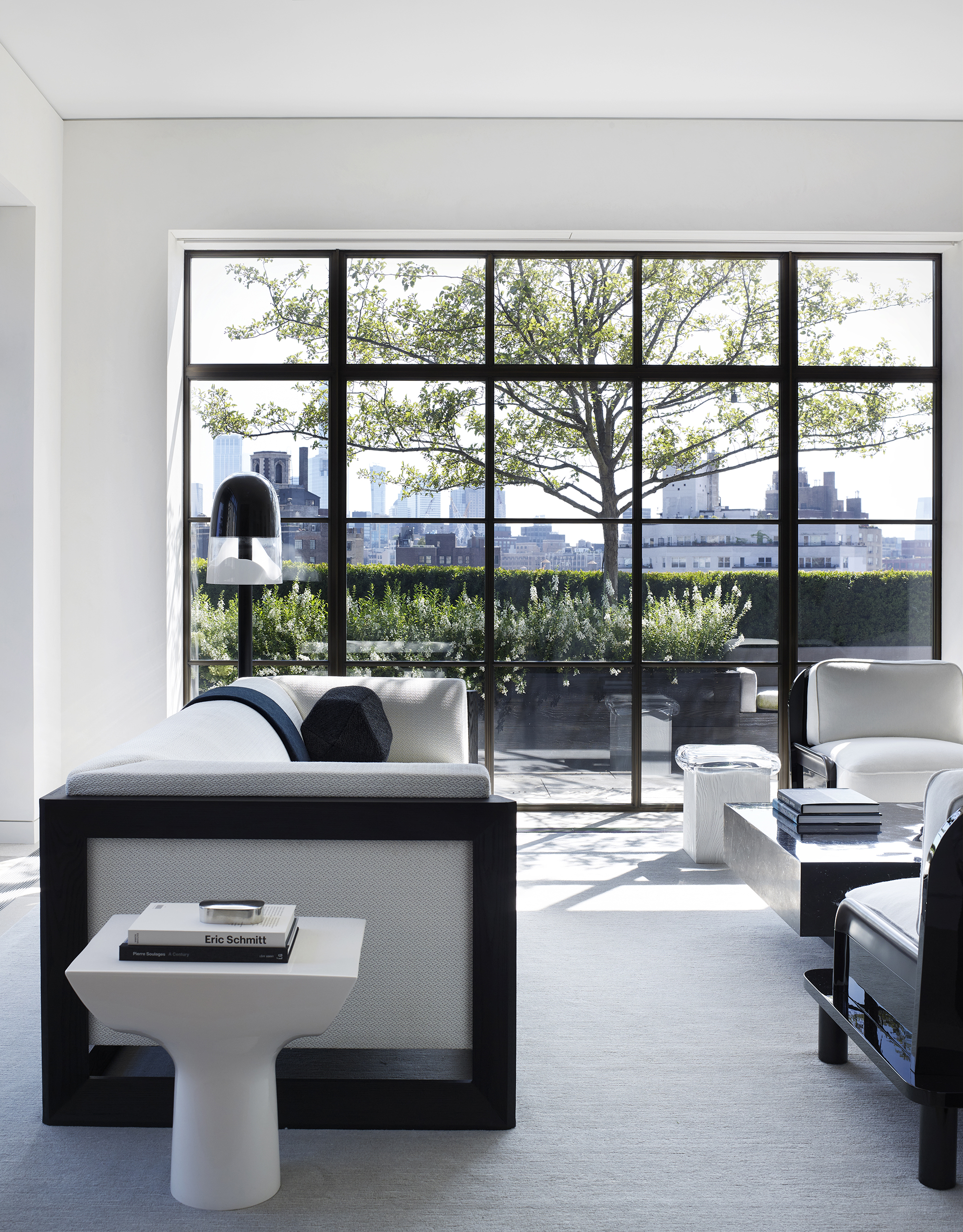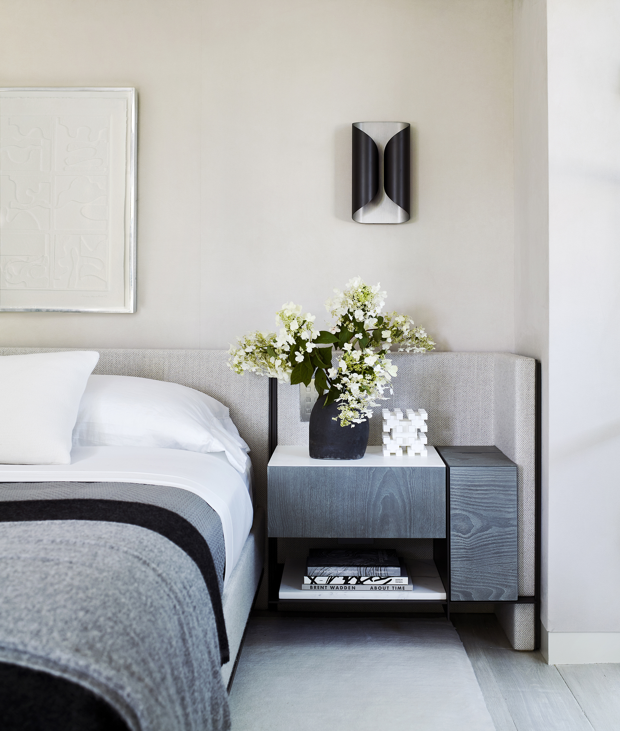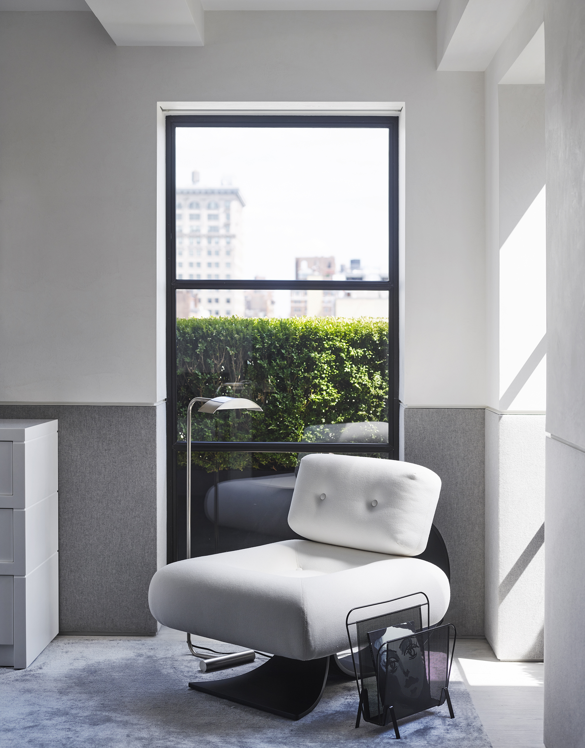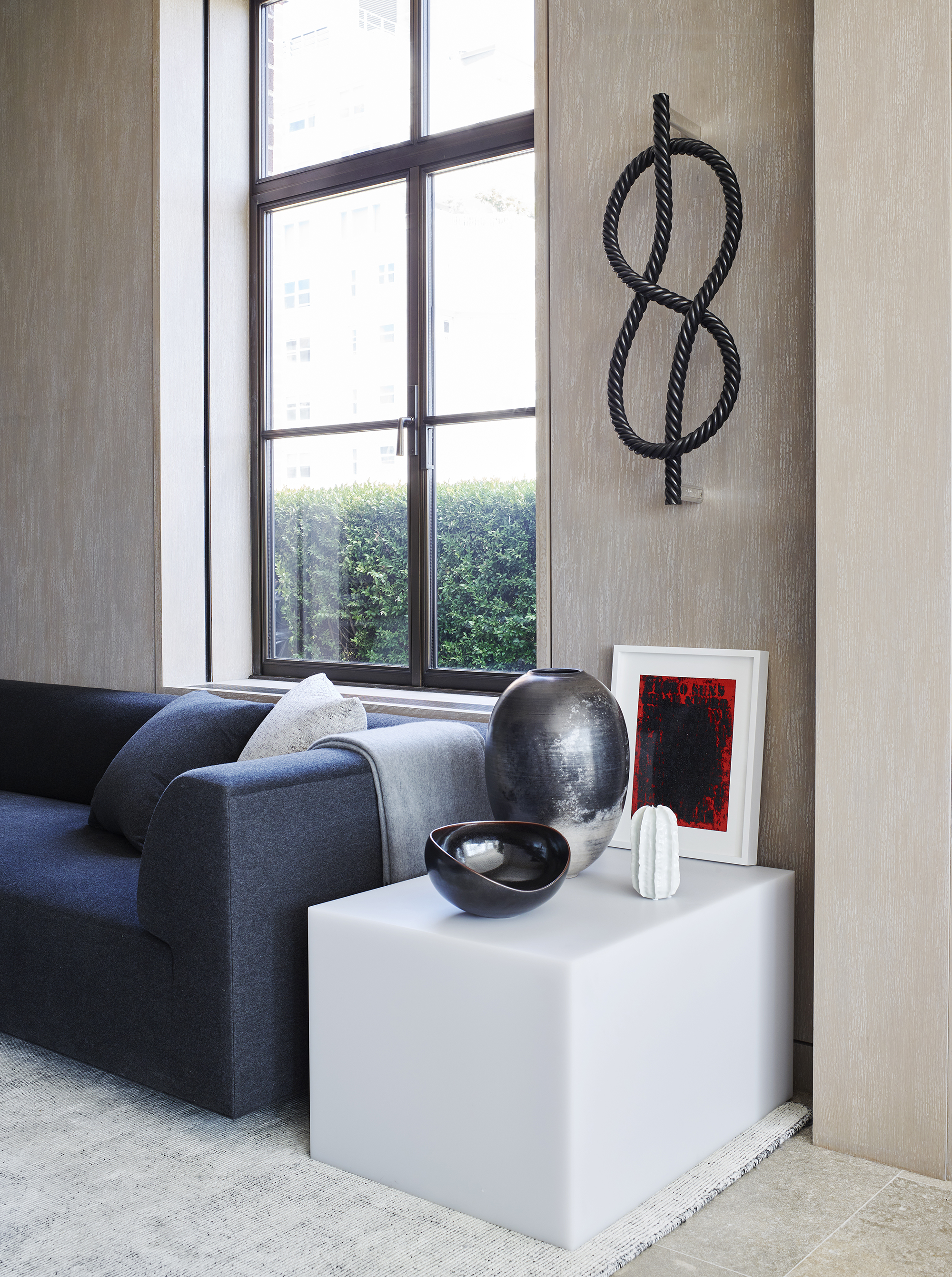 The West Village Penthouse, featured in Galerie Magazine, is a 3,800 SF, 2-bed, 3.5-bath bachelor’s residence with a wrap-around terrace designed in a monochromatic color scheme to reflect the sleek, highly tailored environment the client desired and executed to GRADE’s exacting standards of quality. In addition to a new, open plan kitchen and sleek, modern baths, architectural features and existing limestone and wood floors were refinished to create a cool, cohesive feeling throughout. Artful elements and furnishings lend graphic qualities to each space with a mix of GRADE custom, vintage and contemporary pieces by modern-day masters Eric Schmitt, Pierre Yovanovitch and Mathieu Lehanneur. GRADE’s vision and aesthetic translated the client’s preference for black, white and grey tones into rich materials, fabrics and finishes with luxurious wall treatments in Loro Piana cashmere, suede and Venetian plaster alongside cerused oak and bleached ash, infusing texture and warmth throughout. A curated art collection completes the vision, adding measured splashes of color in works by George Condo, Pat Steir, Glenn Ligon, Richard Prince and Pierre Soulages—bringing this home to life.
