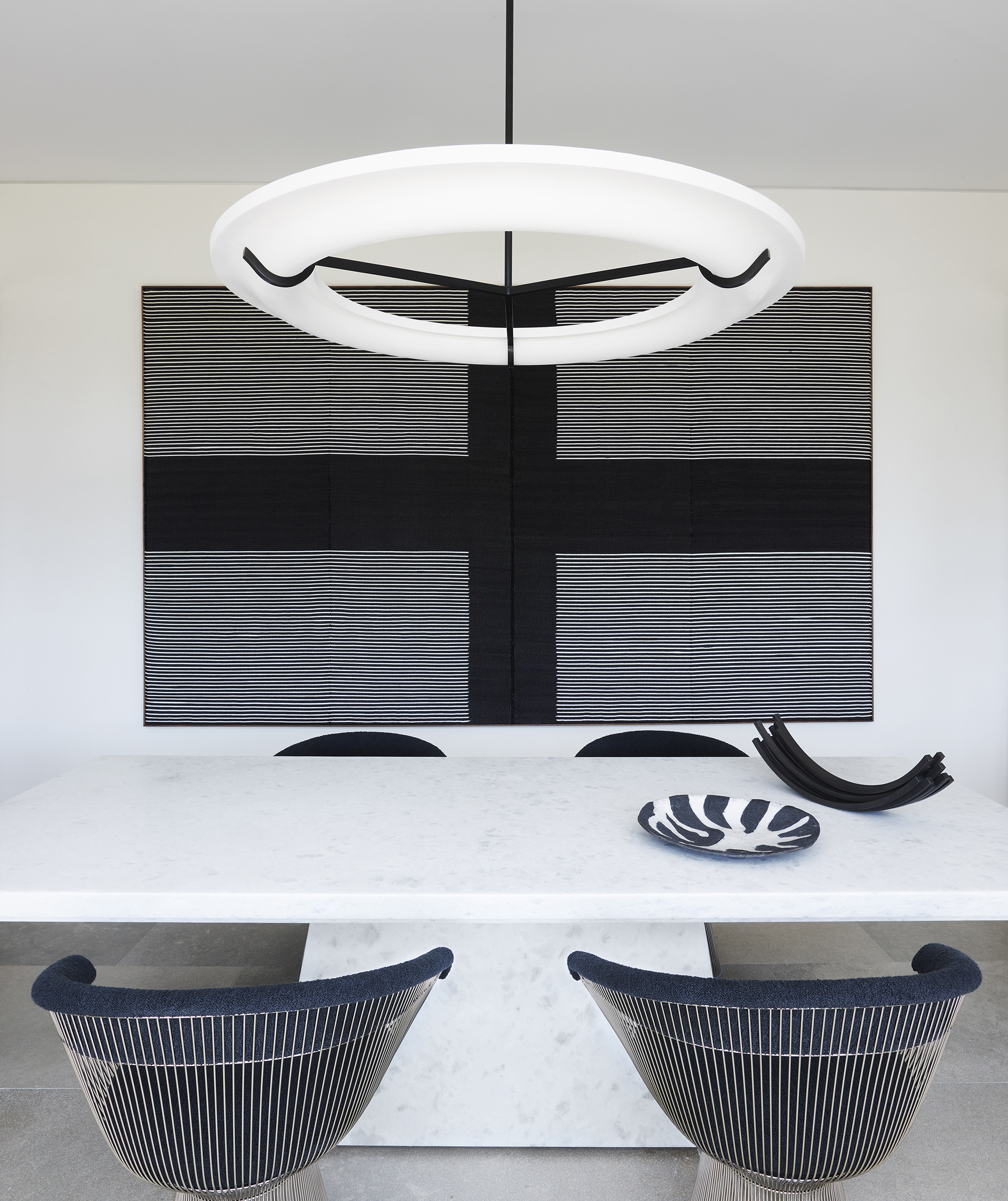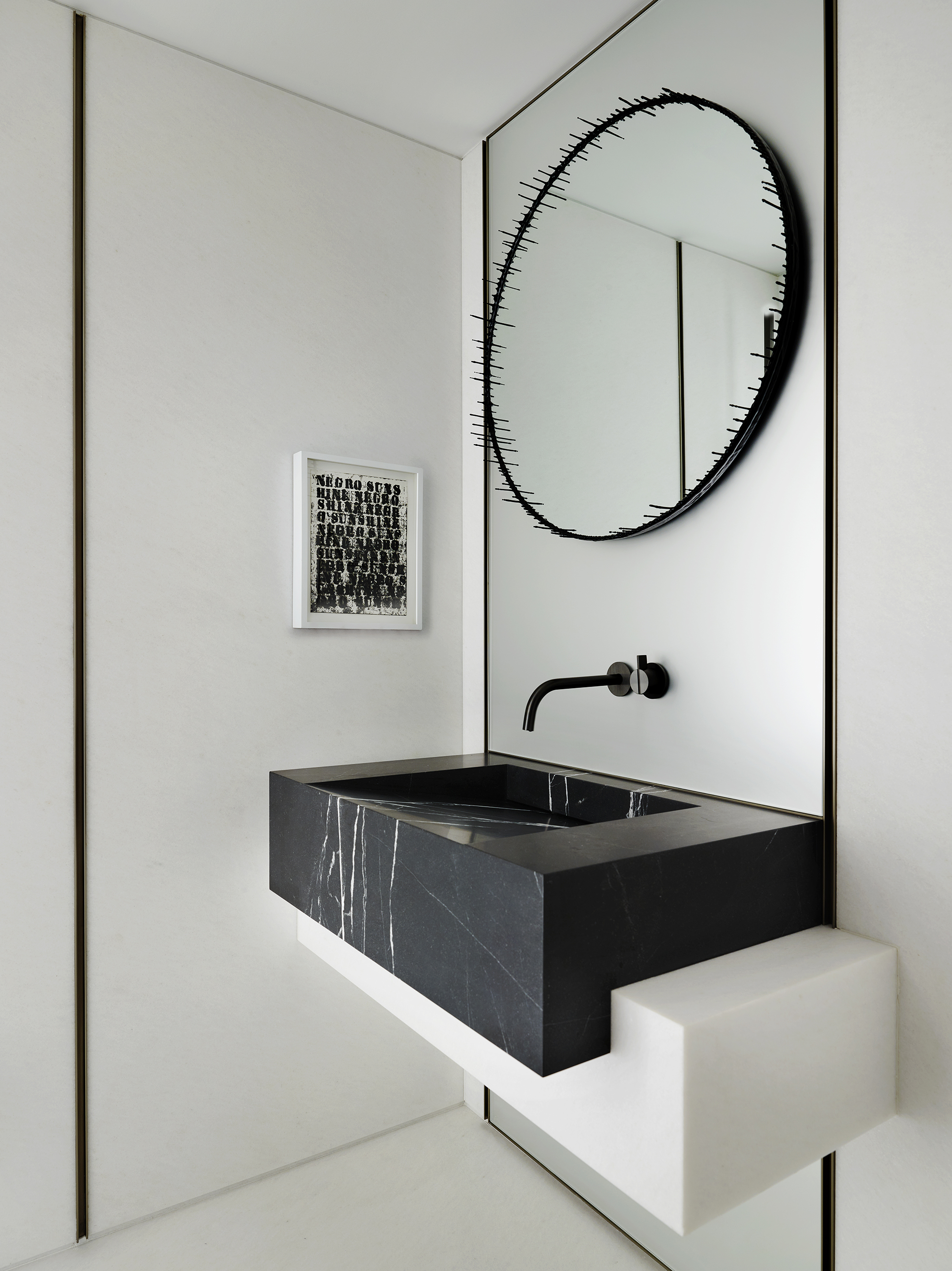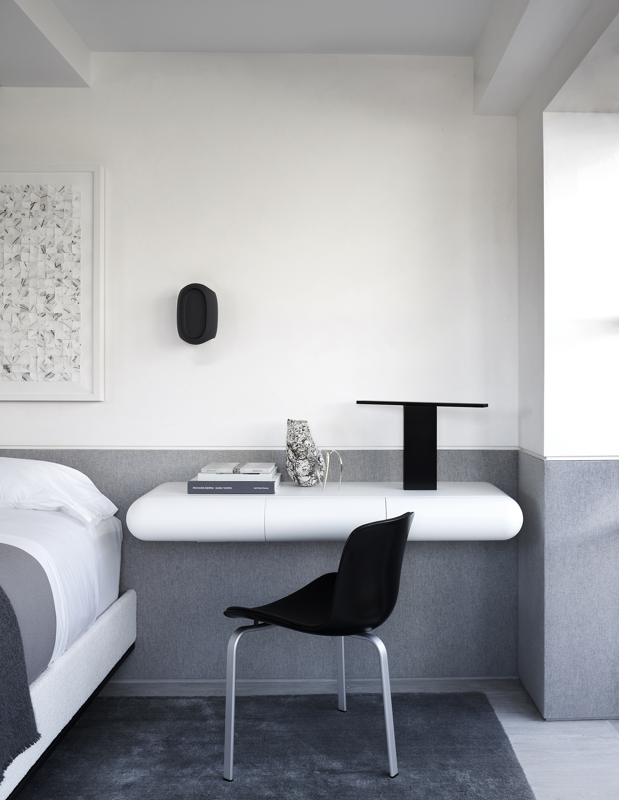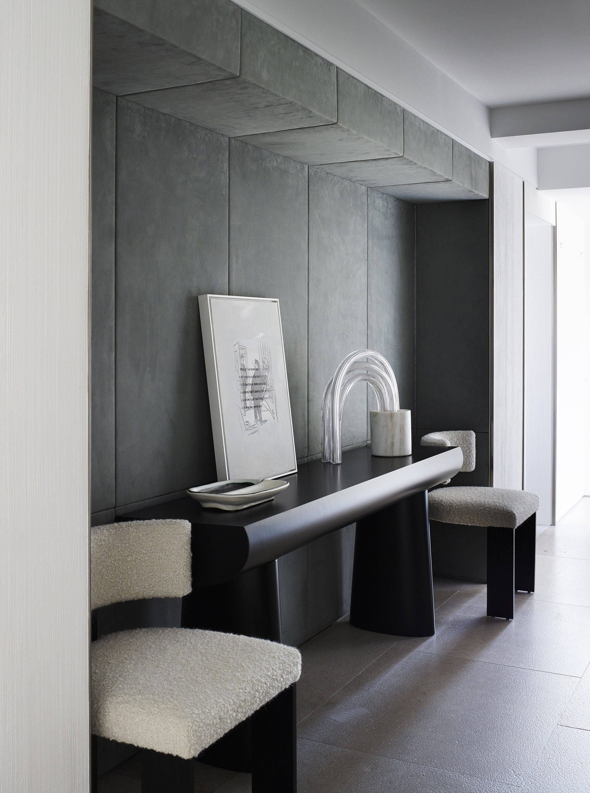 The West Village Penthouse, featured in Galerie Magazine, is a 3,800 SF, 2-bed, 3.5-bath bachelor’s residence with a wrap-around terrace designed in a monochromatic color scheme to reflect the sleek, highly tailored environment the client desired and executed to GRADE’s exacting standards of quality. In addition to a new, open plan kitchen and sleek, modern baths, architectural features and existing limestone and wood floors were refinished to create a cool, cohesive feeling throughout. Artful elements and furnishings lend graphic qualities to each space with a mix of GRADE custom, vintage and contemporary pieces by modern-day masters Eric Schmitt, Pierre Yovanovitch and Mathieu Lehanneur. GRADE’s vision and aesthetic translated the client’s preference for black, white and grey tones into rich materials, fabrics and finishes with luxurious wall treatments in Loro Piana cashmere, suede and Venetian plaster alongside cerused oak and bleached ash, infusing texture and warmth throughout. A curated art collection completes the vision, adding measured splashes of color in works by George Condo, Pat Steir, Glenn Ligon, Richard Prince and Pierre Soulages—bringing this home to life.