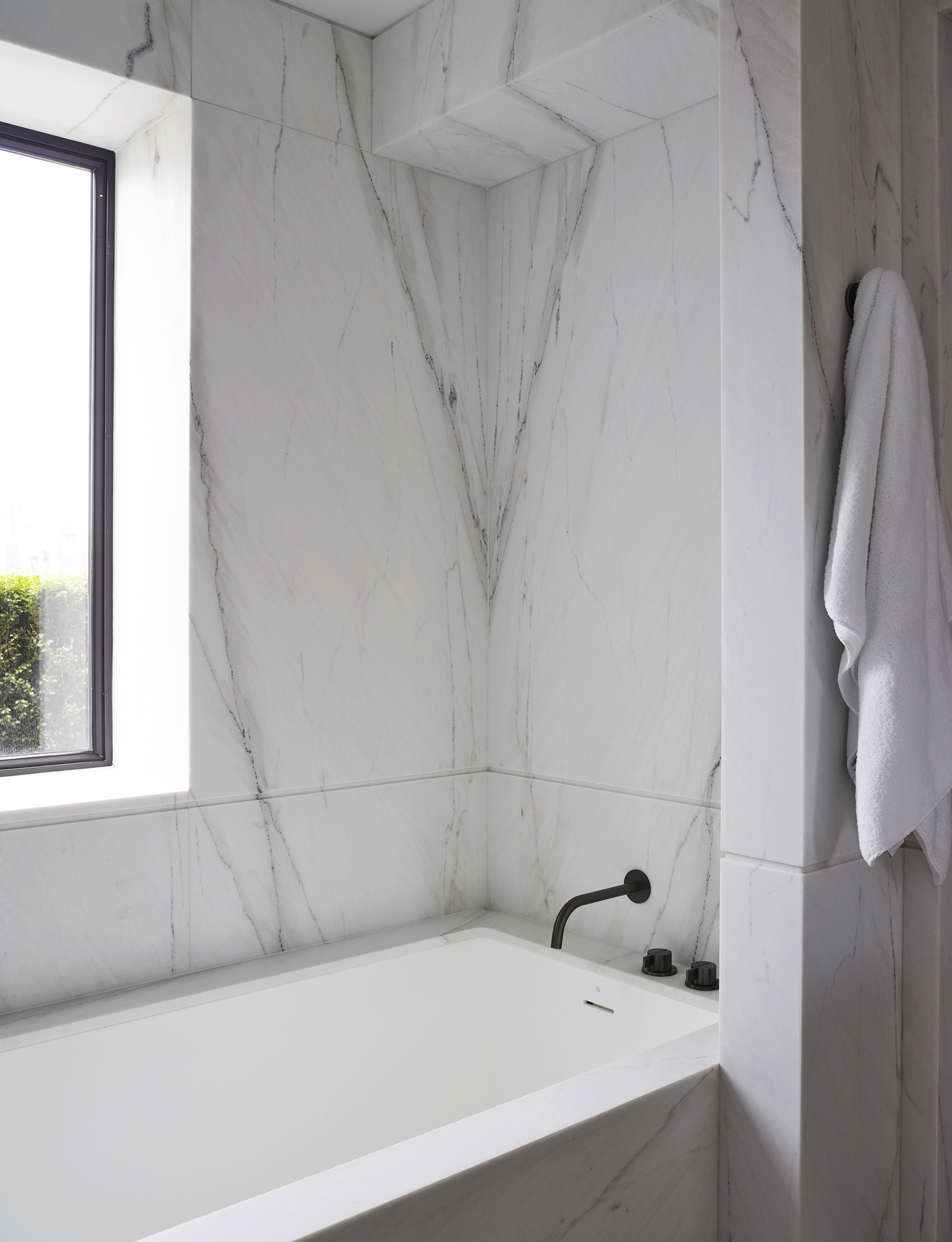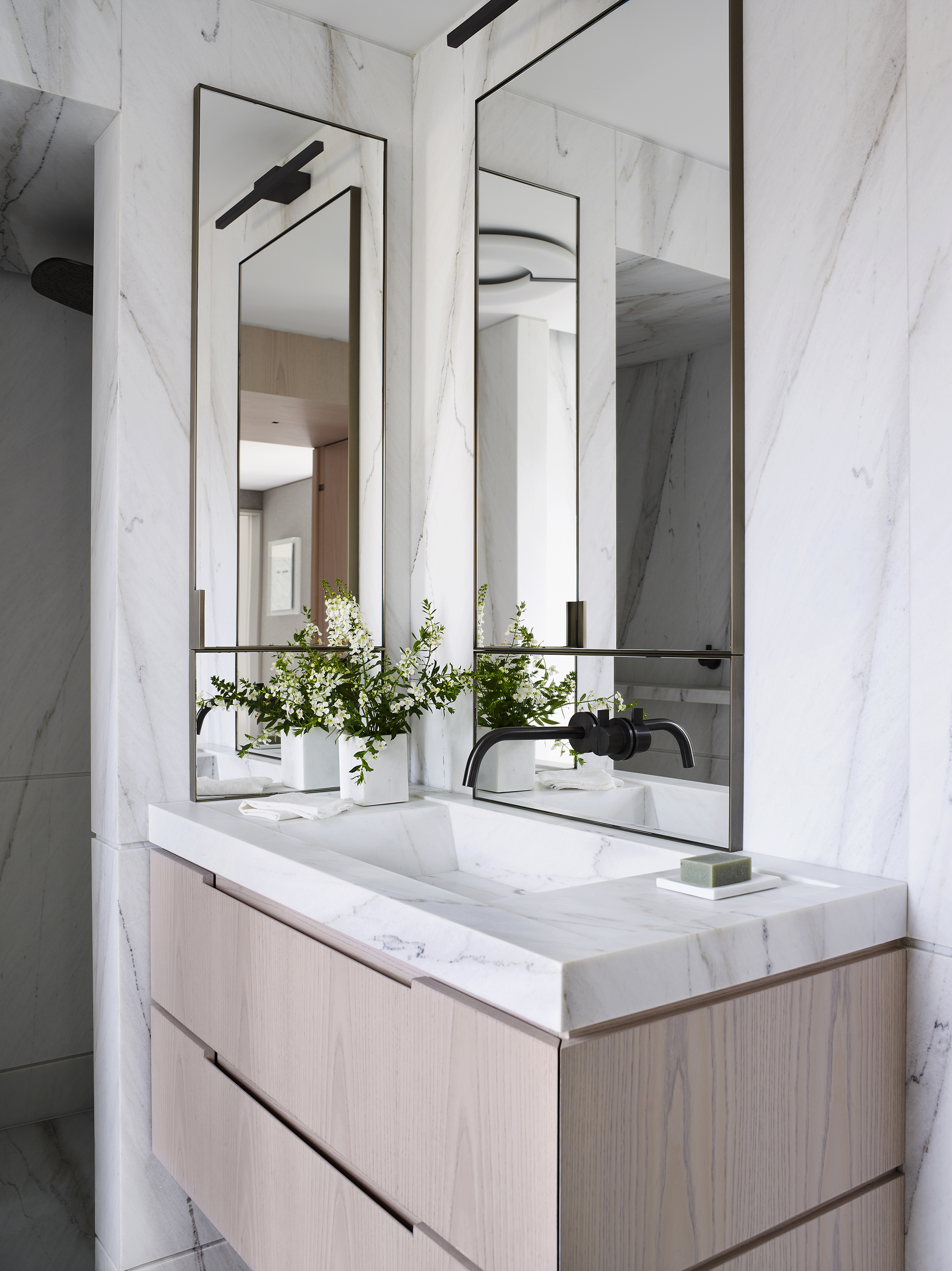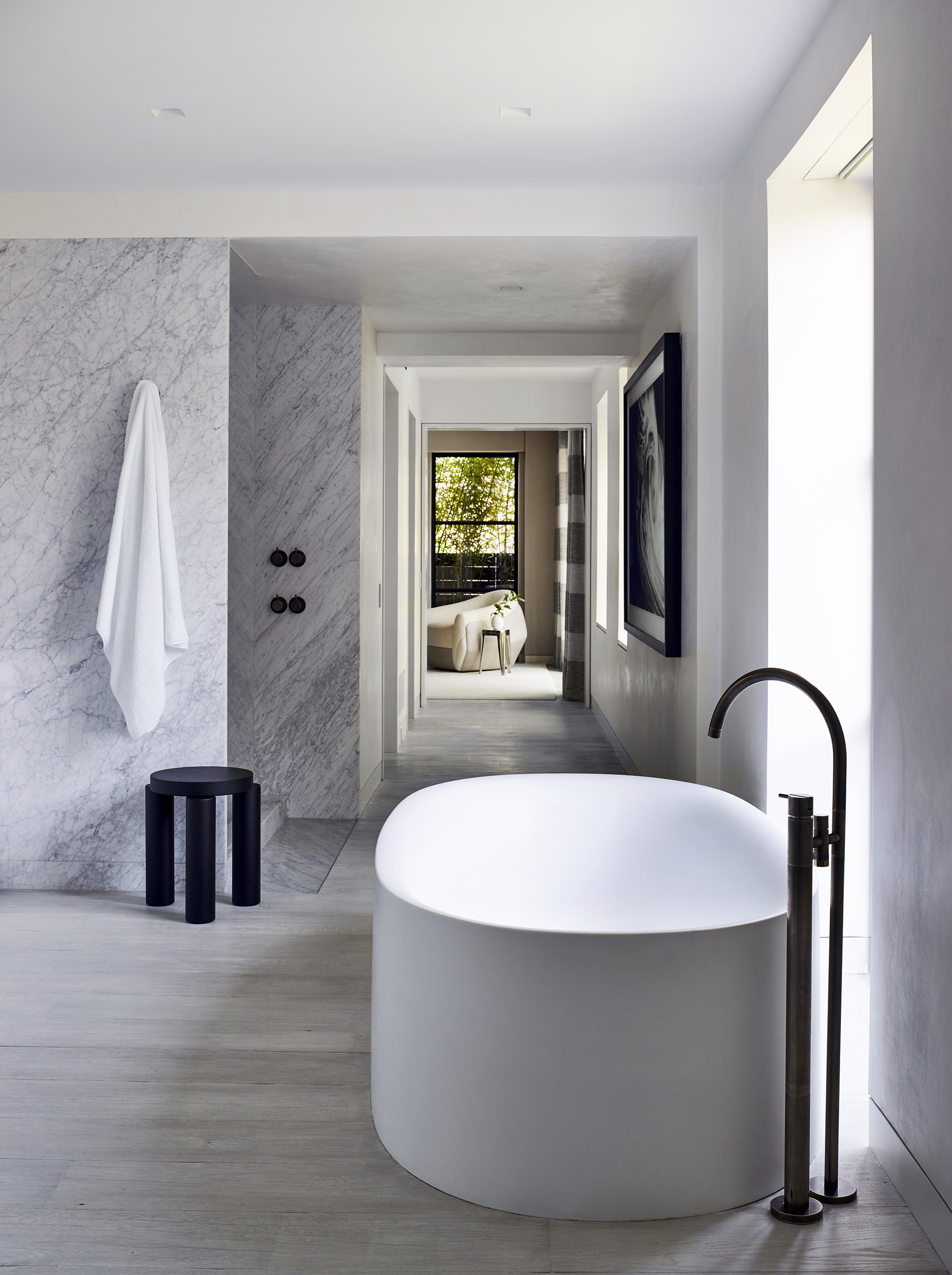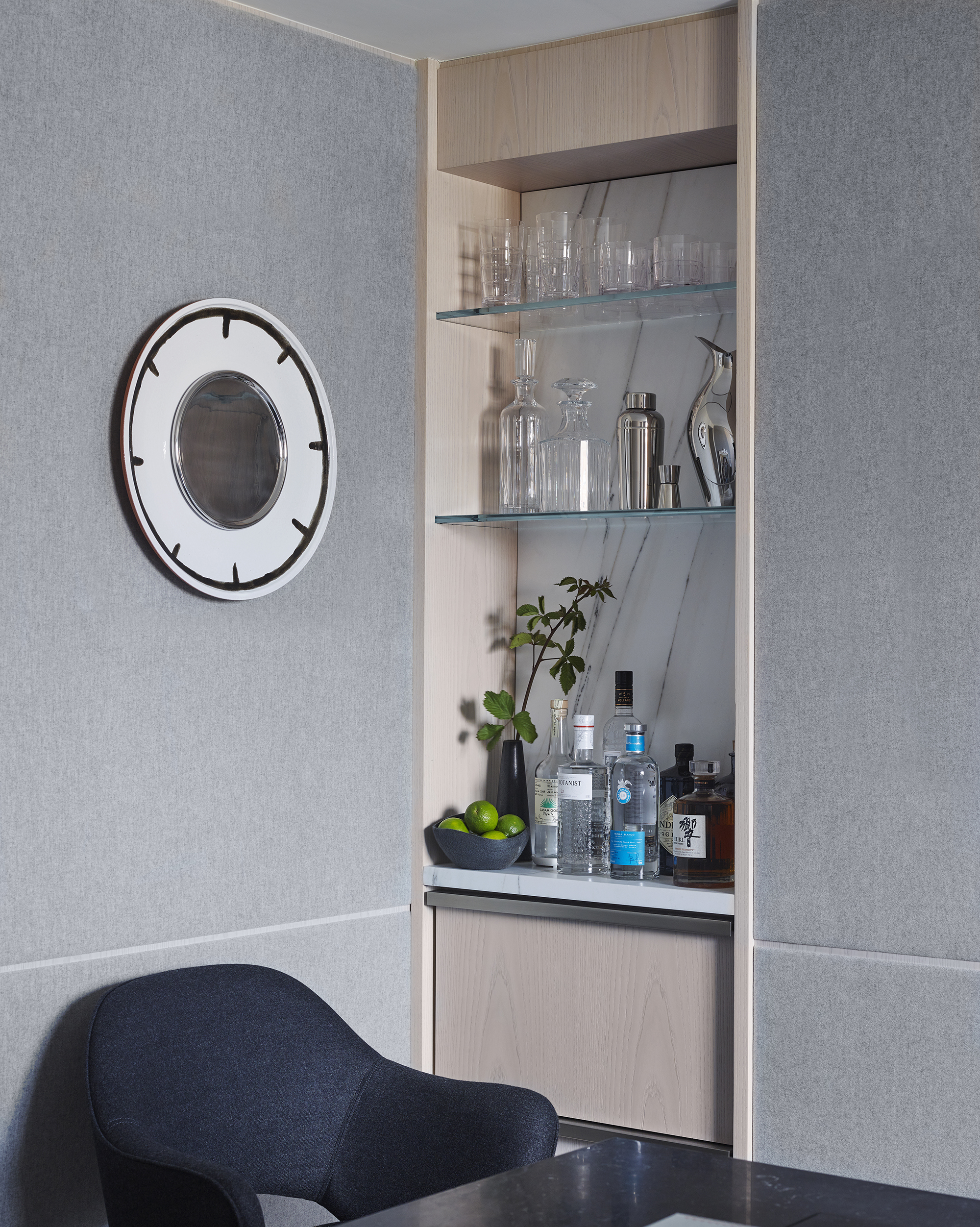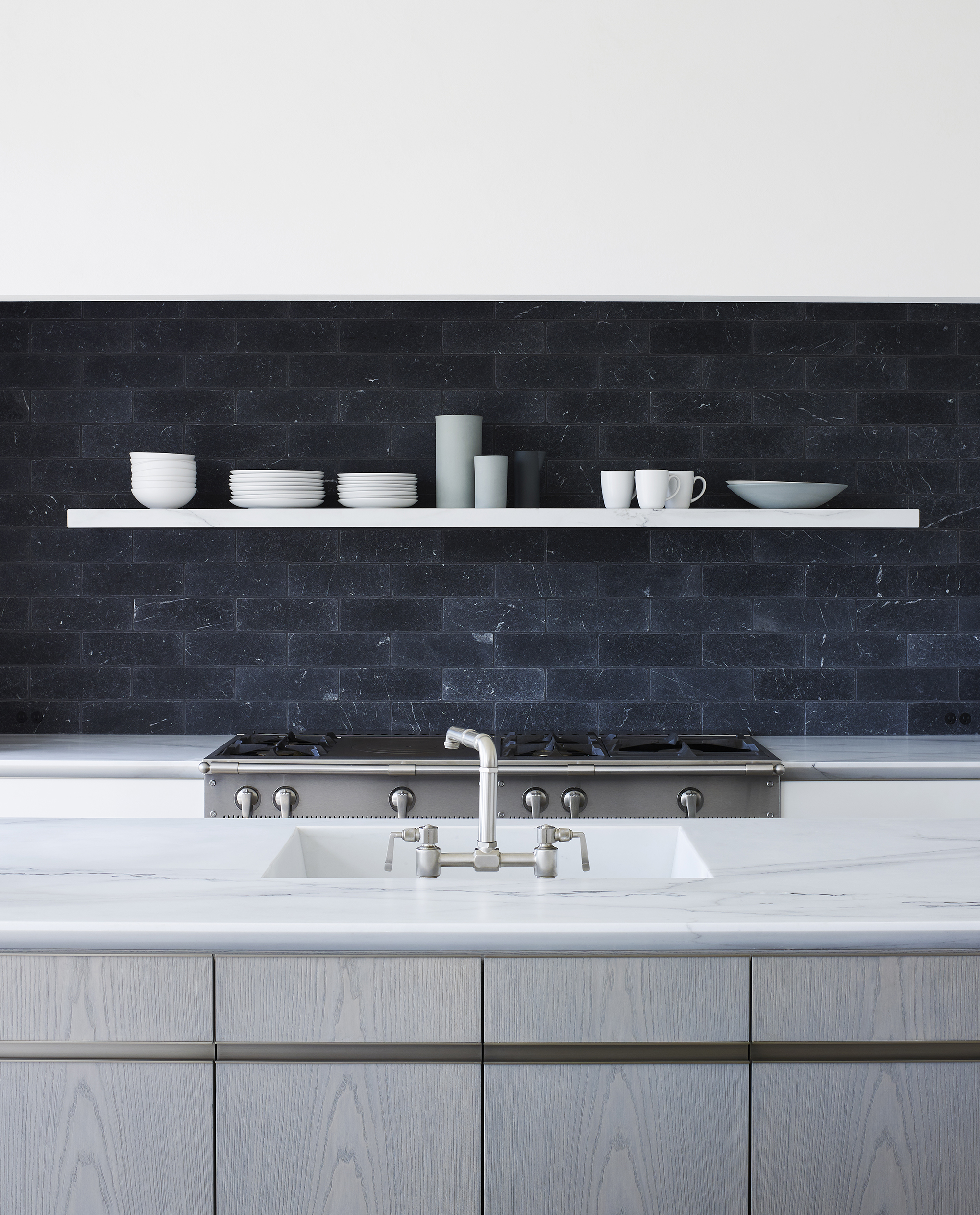 The West Village Penthouse, featured in Galerie Magazine, is a 3,800 SF, 2-bed, 3.5-bath bachelor’s residence with a wrap-around terrace designed in a monochromatic color scheme to reflect the sleek, highly tailored environment the client desired and executed to GRADE’s exacting standards of quality. In addition to a new, open plan kitchen and sleek, modern baths, architectural features and existing limestone and wood floors were refinished to create a cool, cohesive feeling throughout. Artful elements and furnishings lend graphic qualities to each space with a mix of GRADE custom, vintage and contemporary pieces by modern-day masters Eric Schmitt, Pierre Yovanovitch and Mathieu Lehanneur. GRADE’s vision and aesthetic translated the client’s preference for black, white and grey tones into rich materials, fabrics and finishes with luxurious wall treatments in Loro Piana cashmere, suede and Venetian plaster alongside cerused oak and bleached ash, infusing texture and warmth throughout. A curated art collection completes the vision, adding measured splashes of color in works by George Condo, Pat Steir, Glenn Ligon, Richard Prince and Pierre Soulages—bringing this home to life.